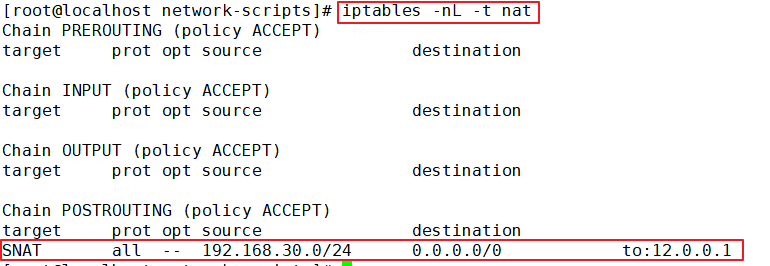 (1)配置SNAT转发规则 vim /etc/sysctl.conf net.ipv4.ip_forward = 1 或 echo '1' > /proc/sys/net/ipv4/ip_forward sysctl -p iptables -t nat -F iptables -F iptables -t nat -A POSTROUTING -s 192.168.30.0/24 -o ens36 -j SNAT --to-source 12.0.0.1 (2)加载LVS内核模块 modprobe ip_vs #加载 ip_vs模块 cat /proc/net/ip_vs #查看 ip_vs版本信息 (3)安装ipvsadm 管理工具 yum -y install ipvsadm