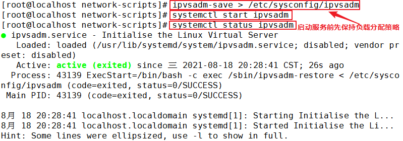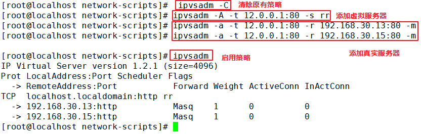ipvsadm -d -t 12.0.0.1:80 -r 192.168.30.13:80 -m [-w 1] #删除群集中某一节点服务器 ipvsadm -D -t 12.0.0.1:80 #删除整个虚拟服务器 systemctl stop ipvsadm #停止服务(清除策略) systemctl start ipvsadm #启动服务(重建规则)、 ipvsadm-restore < /etc/sysconfig/ipvsadm #恢复LVS 策略