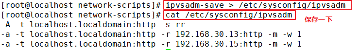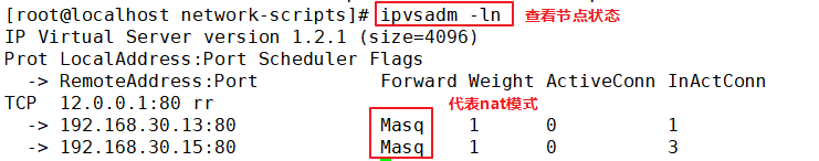ipvsadm-save > /etc/sysconfig/ipvsadm 或者 ipvsadm --save > /etc/sysconfig/ipvsadm systemctl start ipvsadm.service (4)配置负载分配策略(NAT模式只要在服务器上配置,节点服务器不需要特殊配置) ipvsadm -C #清除原有策略 ipvsadm -A -t 12.0.0.1:80 -s rr ipvsadm -a -t 12.0.0.1:80 -r 192.168.30.13:80 -m [-w 1] ipvsadm -a -t 12.0.0.1:80 -r 192.168.30.15:80 -m [-w 1] ipvsadm #启用策略 ipvsadm -ln #查看节点状态,Masq代表 NAT模式 ipvsadm-save > /etc/sysconfig/ipvsadm #保存策略
