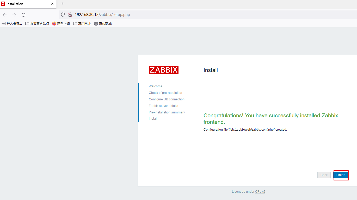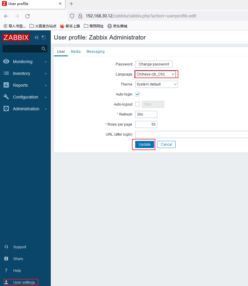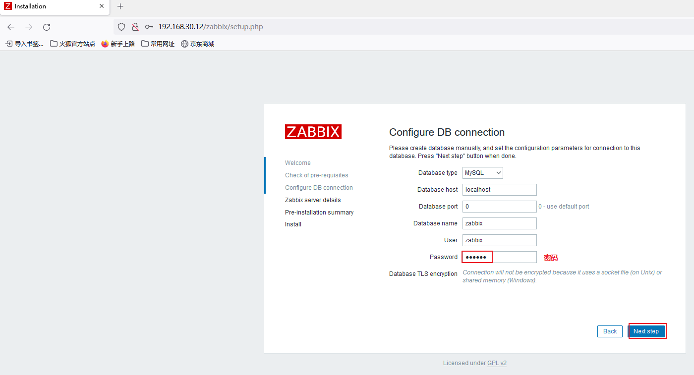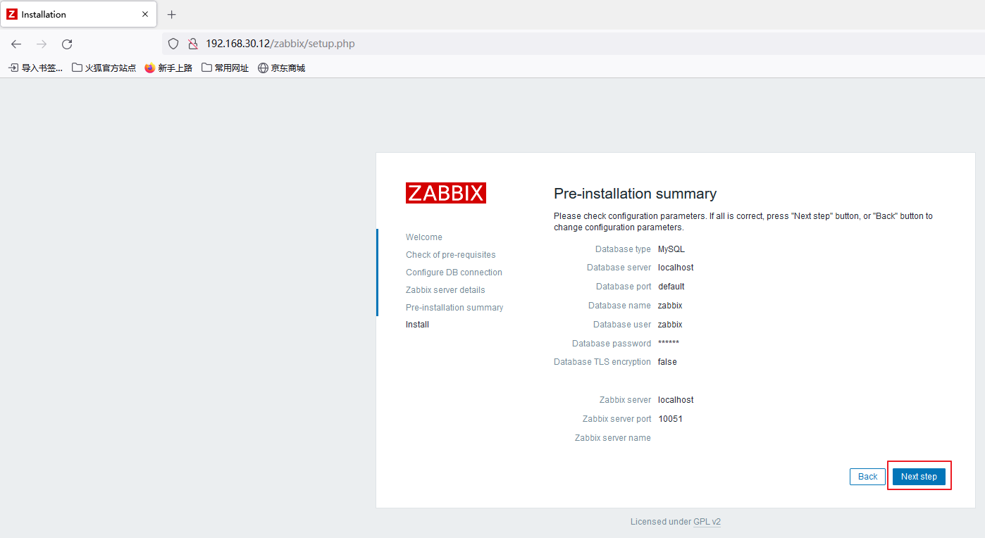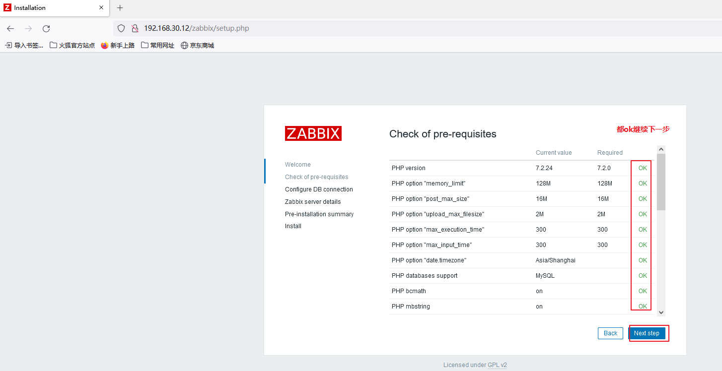 版本最低要 7.2.0 版本。SCL 可以使得在同一台机器上使用多个版本的软件,而又不会影响整个系统的依赖环境。软件包会安装在/opt/rh目录下。 yum install -y centos-release-scl //修改 zabbix-front 前端源,安装 zabbix 前端环境到 scl 环境下 vim zabbix.repo ...... [zabbix-frontend] ...... enabled=1 #开启安装源 ...... yum install -y zabbix-web-mysql-scl zabbix-apache-conf-scl //安装 zabbix 所需的数据库 yum install -y mariadb-server mariadb systemctl enable --now mariadb mysql_secure_installation #初始化数据库,并设置密码,如 zxc123 //添加数据库用户,以及 zabbix 所需的数据库信息 mysql -u root -pzxc123 CREATE DATABASE zabbix character set utf8 collate utf8_bin; GRANT all ON zabbix.* TO 'zabbix'@'%' IDENTIFIED BY 'zabbix'; flush privileges; //导入数据库信息 rpm -ql zabbix-server-mysql #查询 sql 文件的位置 zcat /usr/share/doc/zabbix-server-mysql-5.0.15/create.sql.gz | mysql -uroot -pzxc123 zabbix //修改 zabbix server 配置文件,修改数据库的密码 vim /etc/zabbix/zabbix_server.conf ...... DBPassword=zabbix #124行,指定 zabbix 数据库的密码 //修改 zabbix 的 php 配置文件 vim /etc/opt/rh/rh-php72/php-fpm.d/zabbix.conf ...... php_value[date.timezone] = Asia/Shanghai #24行,取消注释,修改时区 //启动 zabbix 相关服务 systemctl restart zabbix-server zabbix-agent httpd rh-php72-php-fpm systemctl enable zabbix-server zabbix-agent httpd rh-php72-php-fpm 浏览器访问:http://192.168.30.12/zabbix 点击下一步,设置数据库的密码 zabbix 安装完成后,默认的登录账号和密码为:Admin/zabbix 设置文件界面:点击左边菜单栏的【User settings】,【Language】选择 Chinese(zh_CN),再点击 Update 更新。 //解决 zabbix-server Web页面中文乱码问题 yum install -y wqy-microhei-fonts \cp -f /usr/share/fonts/wqy-microhei/wqy-microhei.ttc /usr/share/fonts/dejavu/DejaVuSans.ttf