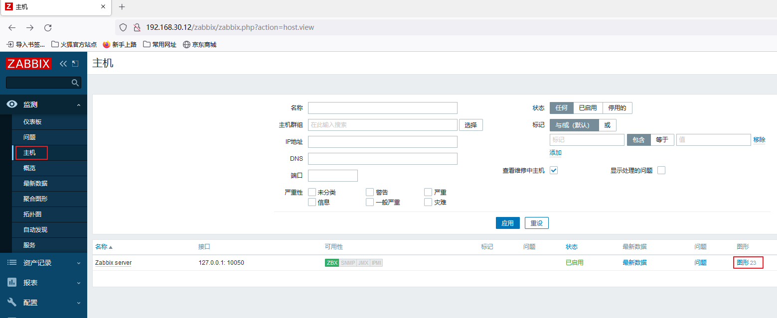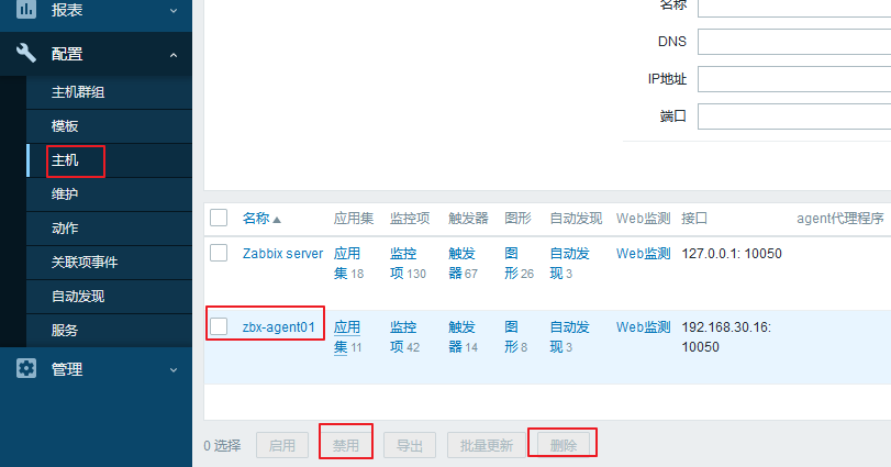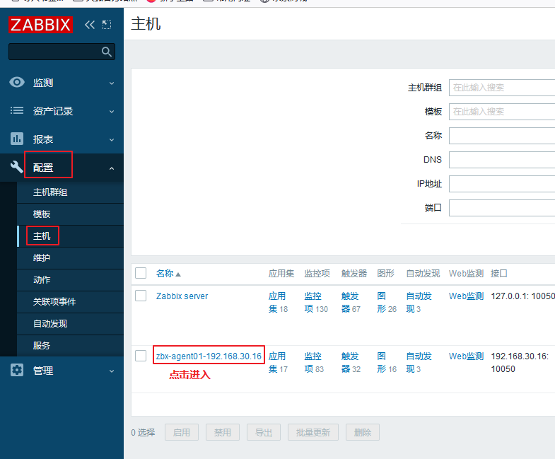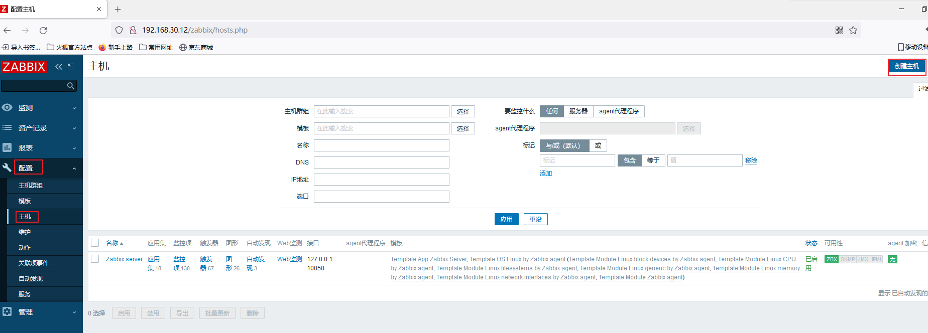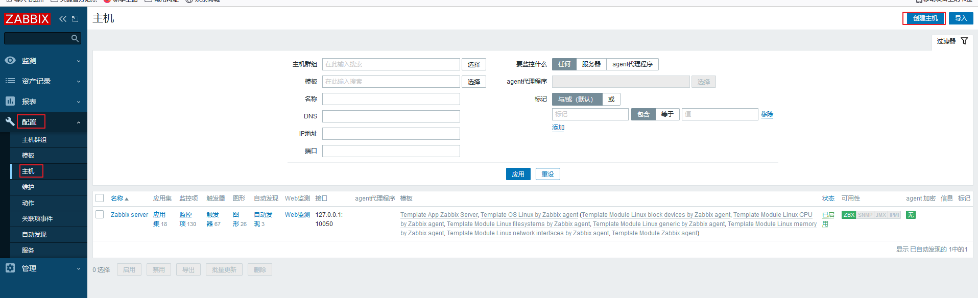 点击左边菜单栏【配置】中的【主机】,点击【创建主机】