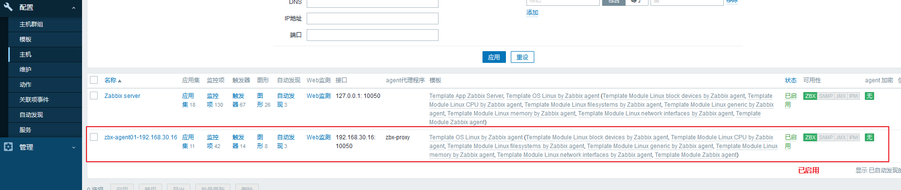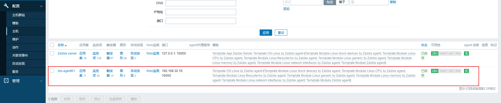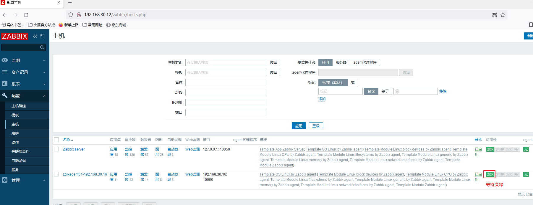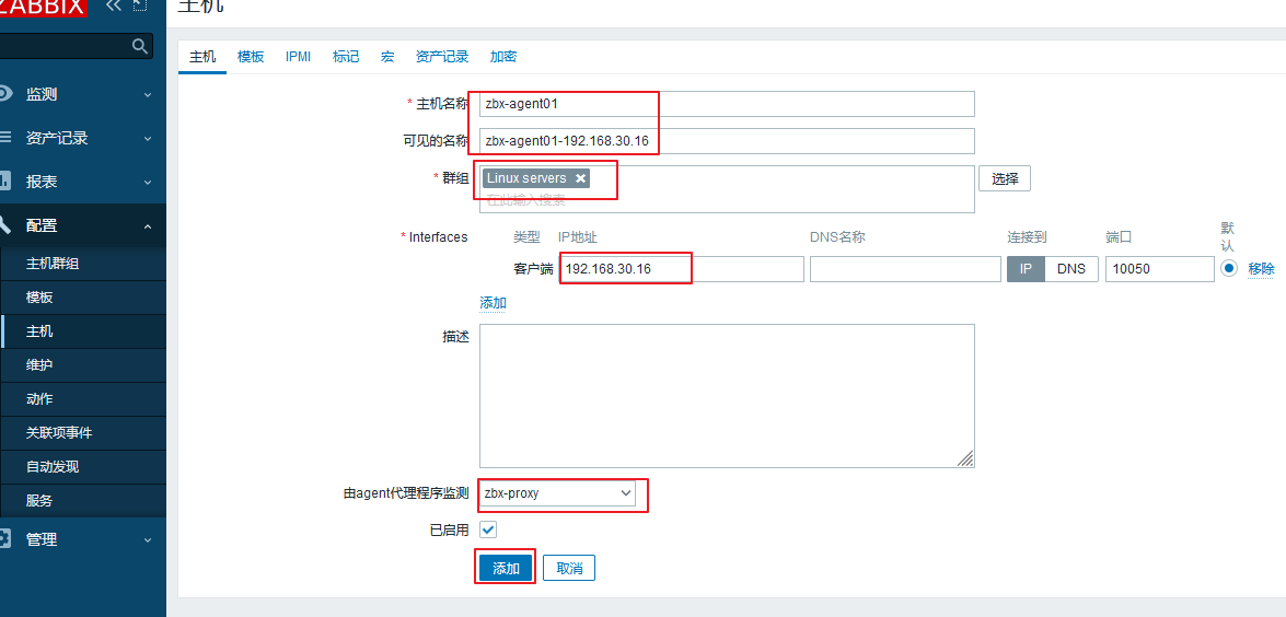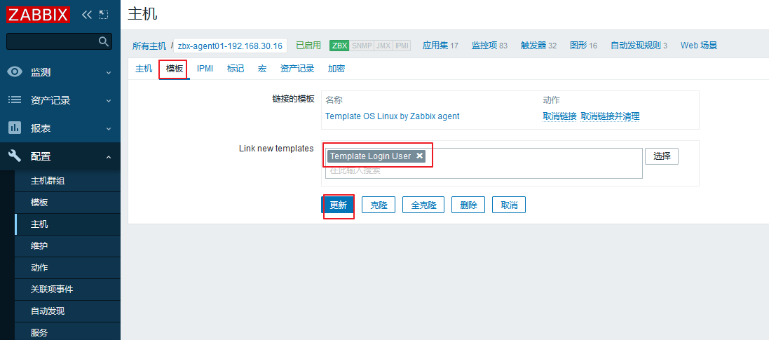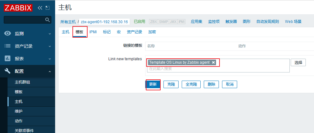 在 Web 页面中添加 agent 主机 点击左边菜单栏【配置】中的【主机】,点击【创建主机】 【主机名称】设置成 zbx-agent01 【可见的名称】设置成 zbx-agent01-192.168.30.16 【群组】选择 Linux server 【Interfaces】的【IP地址】设置成 192.168.30.16 再点击上方菜单栏【模板】 【Link new tamplates】搜索 Linux ,选择 Template OS Linux by Zabbix agent 点击 【添加】