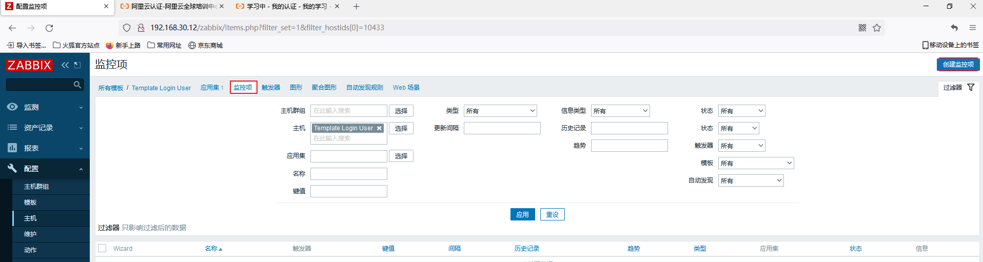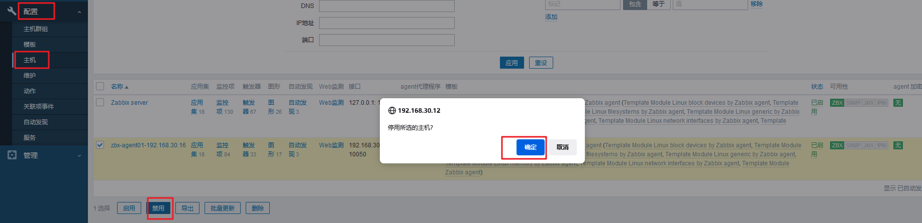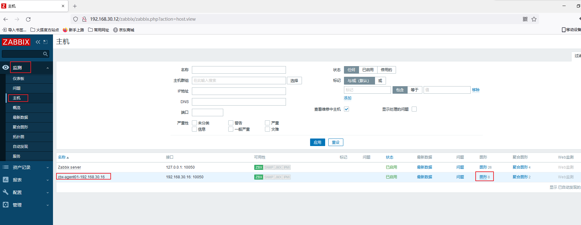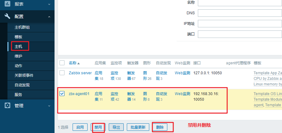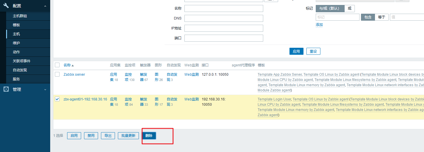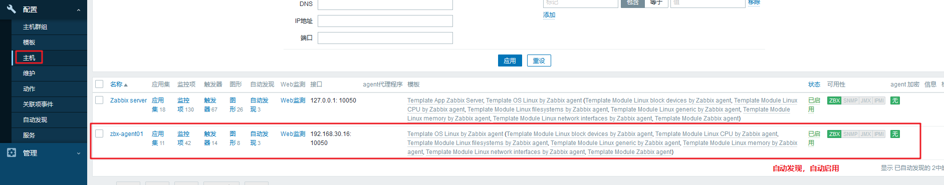 在 Web 页面中添加 agent 主机 点击左边菜单栏【配置】中的【主机】,点击【创建主机】 【主机名称】设置成 zbx-agent01 【可见的名称】设置成 zbx-agent01-192.168.30.16 【群组】选择 Linux server 【Interfaces】的【IP地址】设置成 192.168.30.16 再点击上方菜单栏【模板】 【Link new tamplates】搜索 Linux ,选择 Template OS Linux by Zabbix agent 点击 【添加】