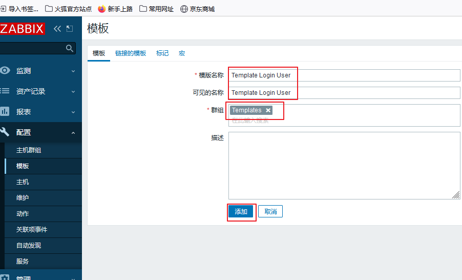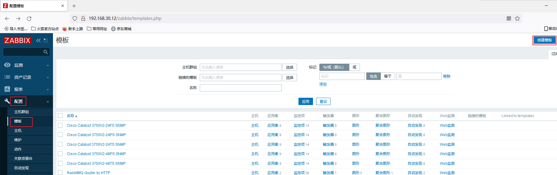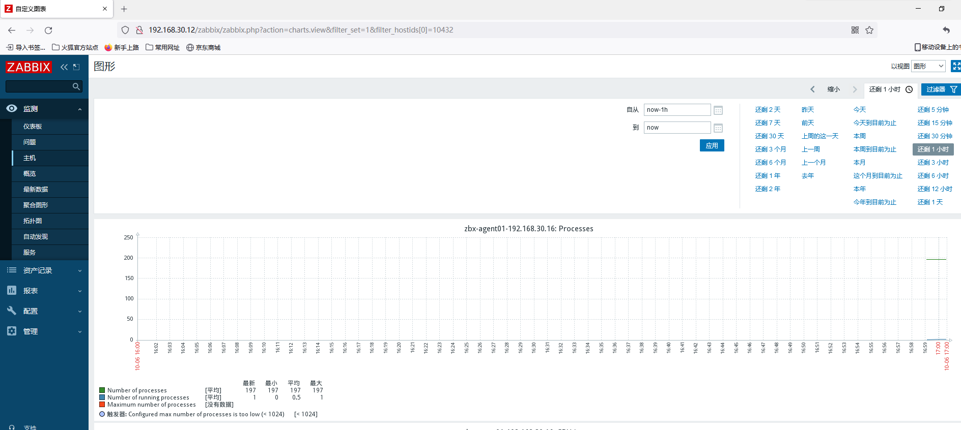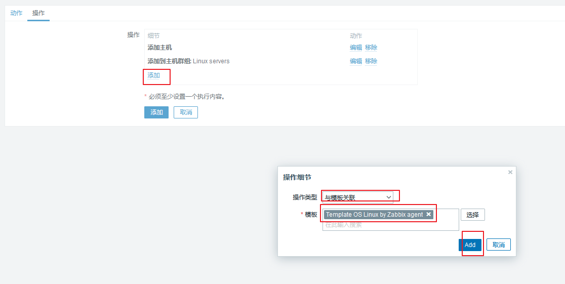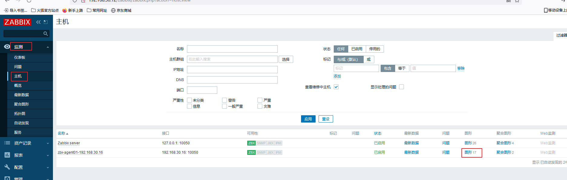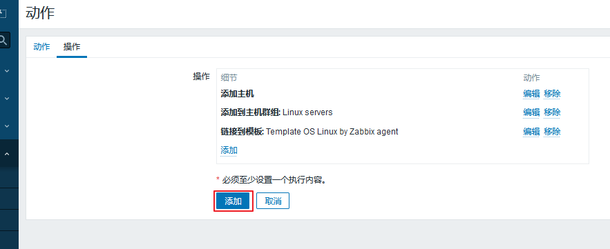 在 Web 页面中添加 agent 主机 点击左边菜单栏【配置】中的【主机】,点击【创建主机】 【主机名称】设置成 zbx-agent01 【可见的名称】设置成 zbx-agent01-192.168.30.16 【群组】选择 Linux server 【Interfaces】的【IP地址】设置成 192.168.30.16 再点击上方菜单栏【模板】 【Link new tamplates】搜索 Linux ,选择 Template OS Linux by Zabbix agent 点击 【添加】