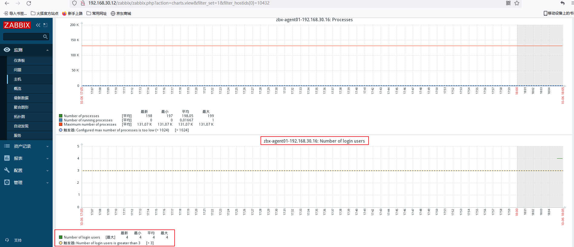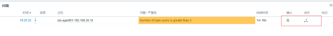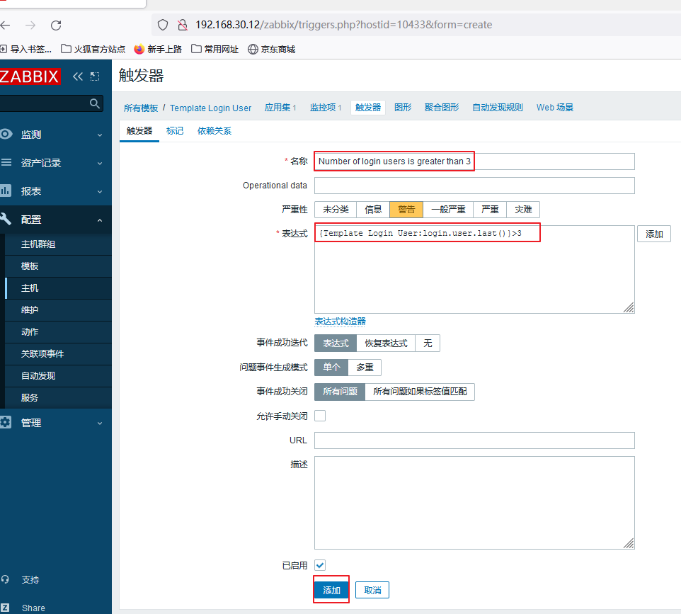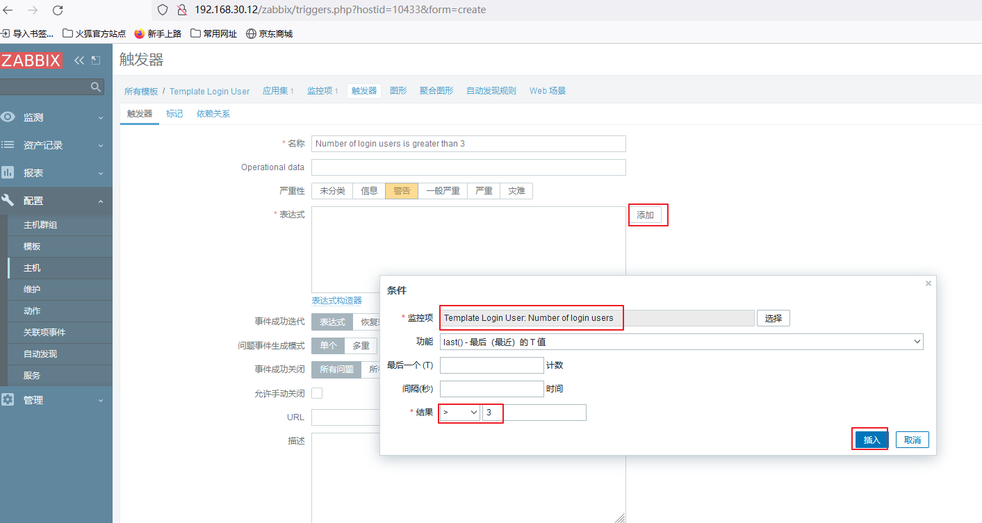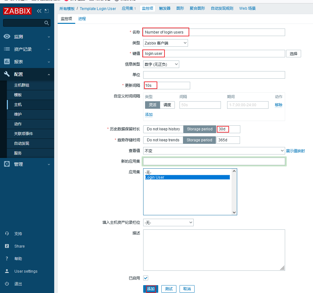 在 Web 页面创建自定义监控项模板 1.创建模板 点击左边菜单栏【配置】中的【模板】,点击【创建模板】 【模板名称】设置成 Template Login User 【可见的名称】设置成 Template Login User 【群组】选择 Template 【描述】可自定义 点击 【添加】,此时就可在【链接的模板】中搜索到 Template Login User 了 2.创建应用集(用于管理监控项的) 点击上方菜单栏【应用集】,点击【创建应用集】 【名称】设置成 Login User 点击 【添加】 3.创建监控项 点击上方菜单栏【监控项】,点击【创建监控项】 【名称】设置成 Number of login users 【键值】设置成 login.user #键值必须要与自定义的监控项配置文件中设置的保持一致 【更新间隔】设置成 10s 【历史数据保留时长】Storage period 30d #保留时间可自定义设置 点击 【添加】 4.创建触发器(当监控项获取到监控的值后和触发器预设的值进行对比,判断是否报警) 点击上方菜单栏【触发器】,点击【创建触发器】 【名称】设置成 Number of login users is greater than 3 【严重性】设置成 一般严重 【表达式】点击添加,【监控项】点击选择 Number of login users,【功能】选择 last(),【结果】选择 > 3,点击 【插入】 点击 【添加】 5.创建图形 点击上方菜单栏【图形】,点击【创建图形】 【名称】设置成 Number of login users 【宽】、【高】可直接采用默认值 【监控项】点击添加勾选相关监控项 Number of login users,【功能】选择 最大,其它可保持默认值 点击 【添加】 6.将主机与模板关联起来(一个主机可以关联多个模板) 点击左边菜单栏【配置】中的【主机】,点击你要关联的主机 点击上方菜单栏【模板】,【Link new tamplates】搜索 login,选择 Template Login User,点击【更新】 此时就点击【监测】中的【主机】,点击你关联主机的【图形】,即可查看到相关的监控项指标 7.设置邮件报警 点击左边菜单栏【管理】中的【报警媒介类型】,点击【创建媒体类型】 【名称】设置成 qq_Email 【SMTP服务器】设置成 smtp.qq.com 【SMTP服务器端口】设置成 25 【SMTP HELO】设置成 qq.com 【SMTP电邮】设置成 自己的邮箱地址,例如 980046487@qq.com 【认证】选择 用户名和密码 【用户名称】设置成 自己的邮箱地址,例如 980046487@qq.com 【密码】可登录QQ邮箱页面,点击【设置】-->【账户】中的【生成授权码】,通过短信获取授权码 【描述】可自定义 点击上方菜单栏【Message templates】,点击【添加】,【Message type】选择 问题,点击【更新】 点击 【添加】,并测试功能 点击左边菜单栏【User settings】-->【报警媒介】,点击【添加】 【类型】选择 qq_Email 【收件人】设置成 980046487@wo.cn 【当启用时】设置成 1-7,00:00-24:00 点击 【添加】 再点击 【更新】 点击左边菜单栏【配置】中的【动作】,选择相对应的动作名称,点击【启用】 //测试邮件报警 增加测试客户端的用户登录数超过触发器预设的值,查看【监测】-->【仪表盘】,确认报警