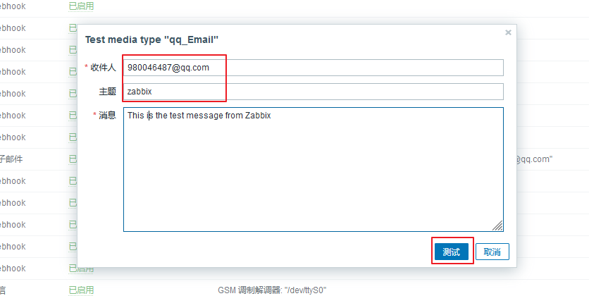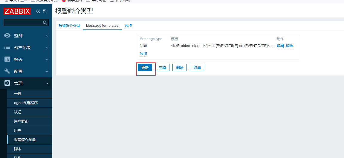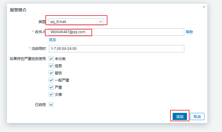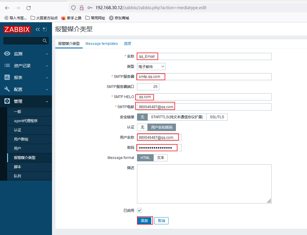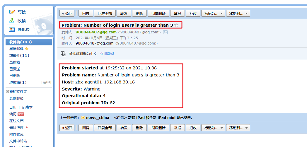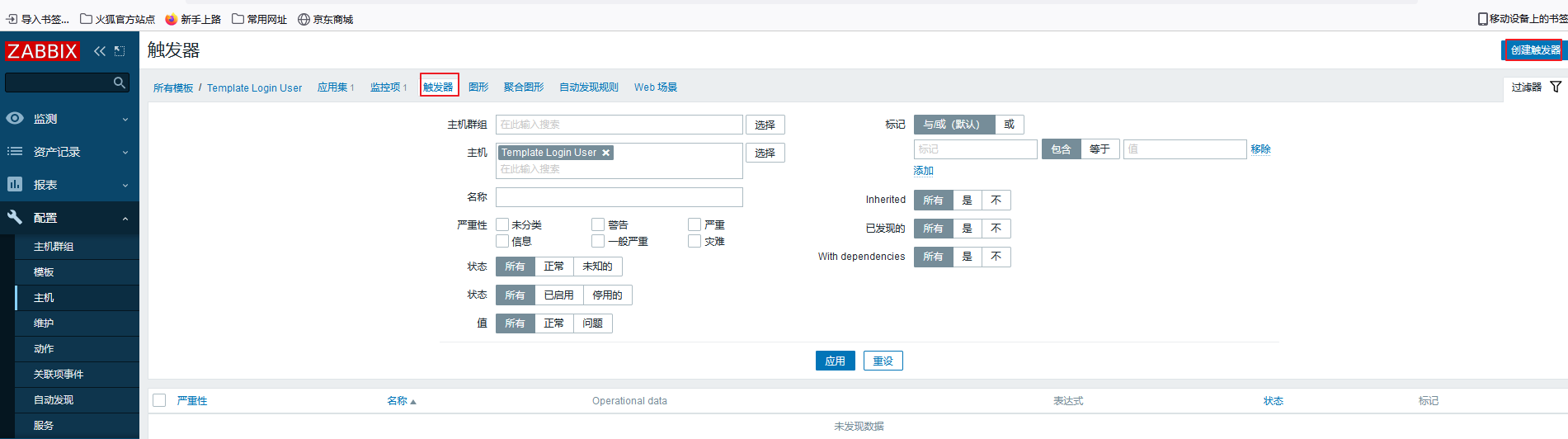 在 Web 页面创建自定义监控项模板 1.创建模板 点击左边菜单栏【配置】中的【模板】,点击【创建模板】 【模板名称】设置成 Template Login User 【可见的名称】设置成 Template Login User 【群组】选择 Template 【描述】可自定义 点击 【添加】,此时就可在【链接的模板】中搜索到 Template Login User 了 2.创建应用集(用于管理监控项的) 点击上方菜单栏【应用集】,点击【创建应用集】 【名称】设置成 Login User 点击 【添加】 3.创建监控项 点击上方菜单栏【监控项】,点击【创建监控项】 【名称】设置成 Number of login users 【键值】设置成 login.user #键值必须要与自定义的监控项配置文件中设置的保持一致 【更新间隔】设置成 10s 【历史数据保留时长】Storage period 30d #保留时间可自定义设置 点击 【添加】 4.创建触发器(当监控项获取到监控的值后和触发器预设的值进行对比,判断是否报警) 点击上方菜单栏【触发器】,点击【创建触发器】 【名称】设置成 Number of login users is greater than 3 【严重性】设置成 一般严重 【表达式】点击添加,【监控项】点击选择 Number of login users,【功能】选择 last(),【结果】选择 > 3,点击 【插入】 点击 【添加】 5.创建图形 点击上方菜单栏【图形】,点击【创建图形】 【名称】设置成 Number of login users 【宽】、【高】可直接采用默认值 【监控项】点击添加勾选相关监控项 Number of login users,【功能】选择 最大,其它可保持默认值 点击 【添加】 6.将主机与模板关联起来(一个主机可以关联多个模板) 点击左边菜单栏【配置】中的【主机】,点击你要关联的主机 点击上方菜单栏【模板】,【Link new tamplates】搜索 login,选择 Template Login User,点击【更新】 此时就点击【监测】中的【主机】,点击你关联主机的【图形】,即可查看到相关的监控项指标 7.设置邮件报警 点击左边菜单栏【管理】中的【报警媒介类型】,点击【创建媒体类型】 【名称】设置成 qq_Email 【SMTP服务器】设置成 smtp.qq.com 【SMTP服务器端口】设置成 25 【SMTP HELO】设置成 qq.com 【SMTP电邮】设置成 自己的邮箱地址,例如 980046487@qq.com 【认证】选择 用户名和密码 【用户名称】设置成 自己的邮箱地址,例如 980046487@qq.com 【密码】可登录QQ邮箱页面,点击【设置】-->【账户】中的【生成授权码】,通过短信获取授权码 【描述】可自定义 点击上方菜单栏【Message templates】,点击【添加】,【Message type】选择 问题,点击【更新】 点击 【添加】,并测试功能 点击左边菜单栏【User settings】-->【报警媒介】,点击【添加】 【类型】选择 qq_Email 【收件人】设置成 980046487@wo.cn 【当启用时】设置成 1-7,00:00-24:00 点击 【添加】 再点击 【更新】 点击左边菜单栏【配置】中的【动作】,选择相对应的动作名称,点击【启用】 //测试邮件报警 增加测试客户端的用户登录数超过触发器预设的值,查看【监测】-->【仪表盘】,确认报警