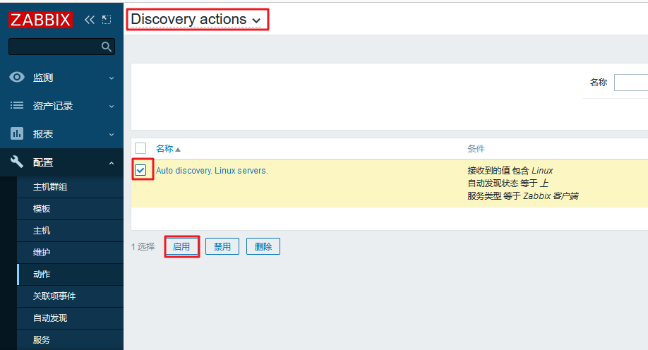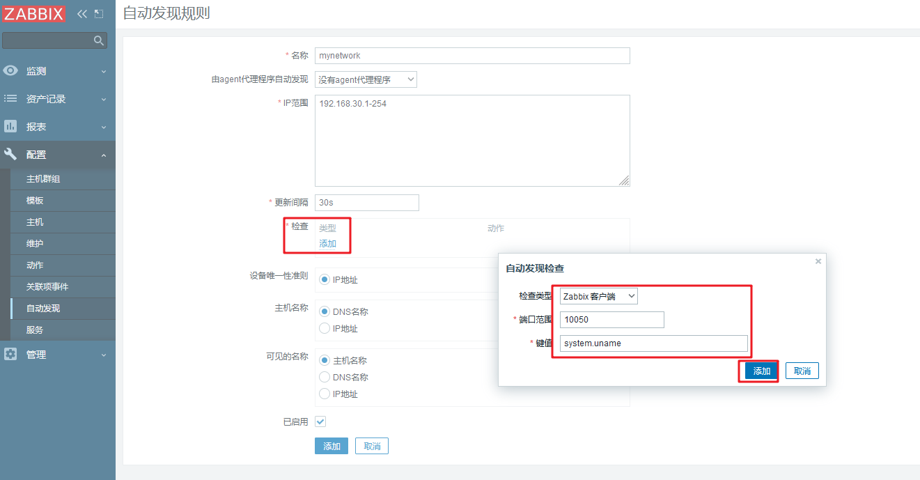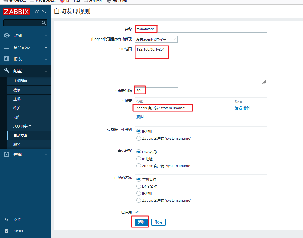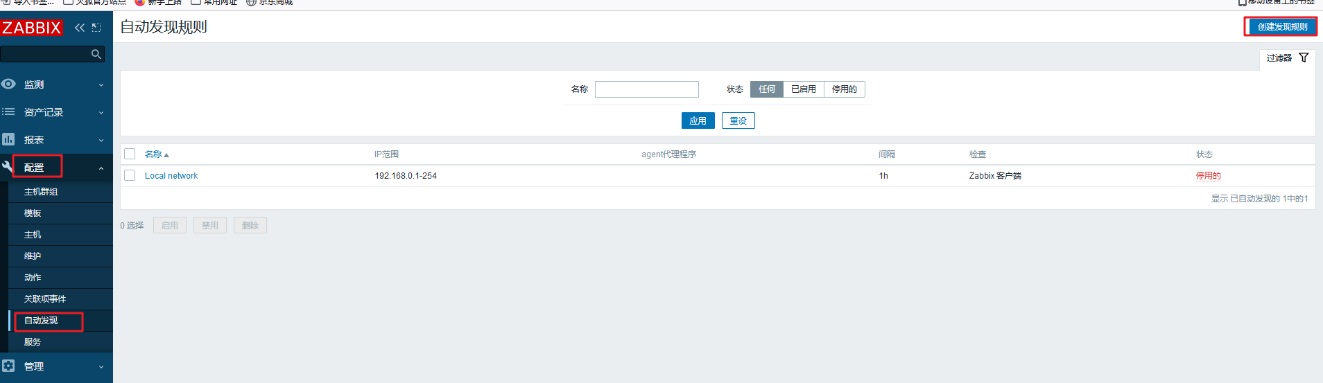 zabbix 自动发现(对于 agent2 是被动模式) zabbix server 主动的去发现所有的客户端,然后将客户端的信息登记在服务端上。 缺点是如果定义的网段中的主机数量多,zabbix server 登记耗时较久,且压力会较大。 1.确保客户端上的 zabbix-agent2 服务状态正常 systemctl is-active zabbix-agent2.service active 2.在 Web 页面删除原有的客户端主机 点击左边菜单栏【配置】中的【主机】,勾选原有的客户端主机,点击 删除 3.在服务端和客户端上配置 hosts 解析 vim /etc/hosts 192.168.30.12 zbx-server 192.168.30.16 zbx-agent01 4.在 Web 页面配置自动发现 点击左边菜单栏【配置】中的【自动发现】,点击【创建发现规则】 【名称】设置成 mynetwork 【IP范围】设置成 192.168.30.1-254 【更新间隔】设置成 30s 【检查】点击【添加】,【检查类型】选择 Zabbix 客户端,【端口范围】设置成 10500,【键值】设置成 system.uname 【设备唯一性准则】选择 IP地址 【主机名称】选择 DNS名称 【可见的名称】选择 主机名称 勾选 【已启用】,点击 【更新】 点击左边菜单栏【配置】中的【动作】,上方菜单选择 【Discovery actions】 勾选 【Auto discovery. Linux servers.】,点击 【启用】 点击左边菜单栏【配置】中的【主机】刷新,等待一段时间后即可刷新出自动发现的客户端主机 可在服务端查看 zabbix 日志 tail -f /var/log/zabbix/zabbix_server.log ...... 6601:20210922:225044.115 enabling Zabbix agent checks on host "zbx-agent01": host became available