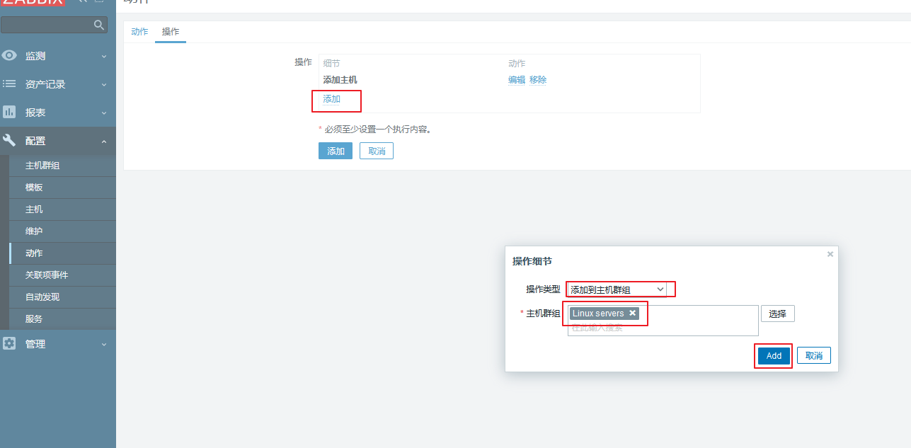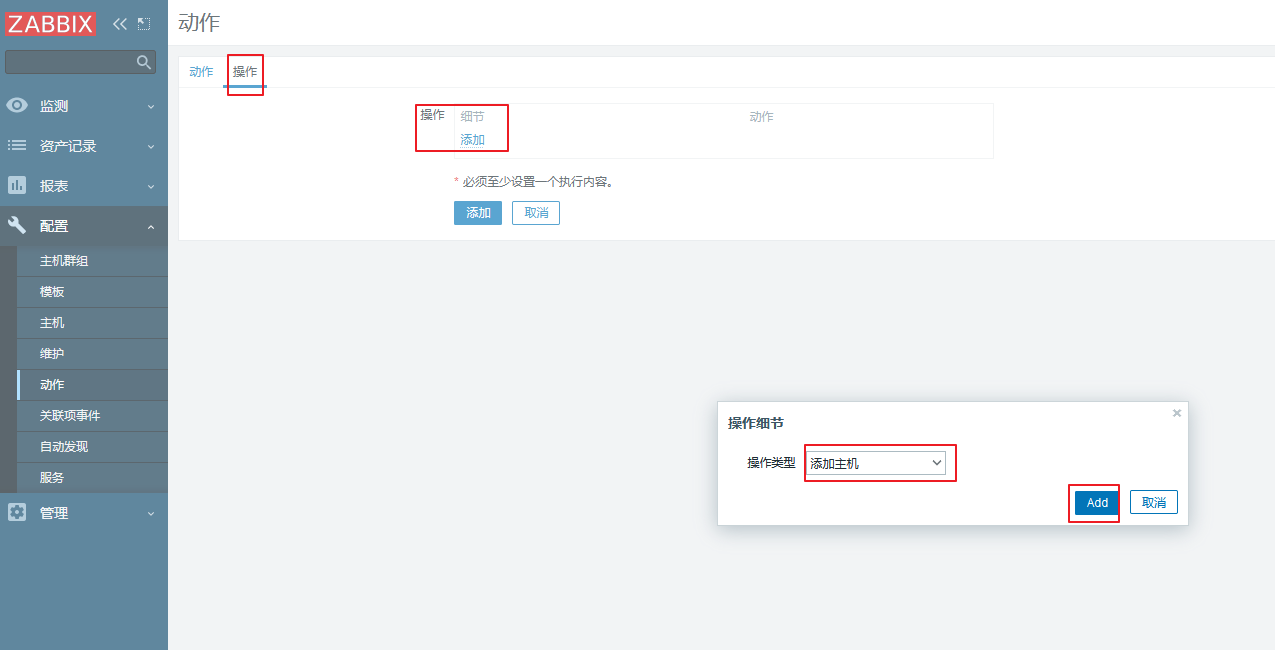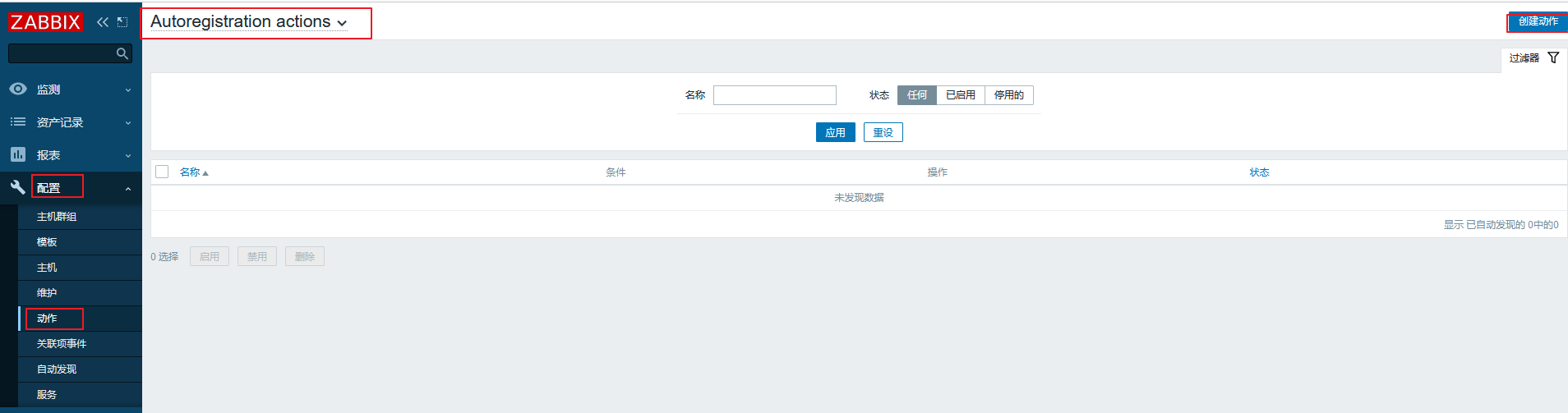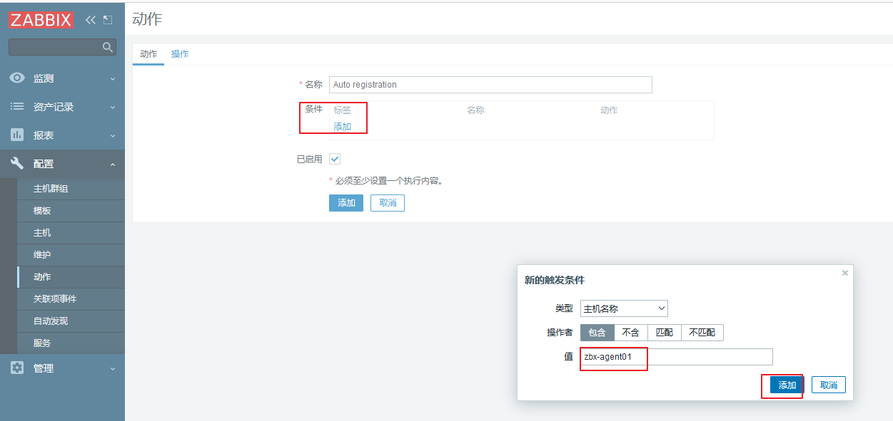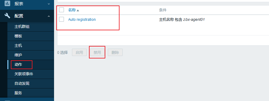 zabbix 自动注册(对于 agent2 是主动模式) zabbix agent2 会主动上报自己的信息,发给 zabbix server。 缺点是可能因为配置文件配置错误或者网络不通等原因导致 zabbix agent2 可能找不到 zabbix server。 1.环境准备 点击左边菜单栏【配置】中的【自动发现】,勾选发现规则,点击 禁用 点击左边菜单栏【配置】中的【主机】,勾选原有的客户端主机,点击 删除 vim /etc/hosts 192.168.30.12 zbx-server 192.168.30.16 zbx-agent01 2.修改 zabbix-agent2 配置文件 vim /etc/zabbix/zabbix_agent2.conf ...... HostnameItem=system.hostname #139行,取消注释 egrep -v "^#|^$" /etc/zabbix/zabbix_agent2.conf PidFile=/var/run/zabbix/zabbix_agent2.pid LogFile=/var/log/zabbix/zabbix_agent2.log LogFileSize=0 Server=192.168.30.12 ServerActive=192.168.30.12 Hostname=zbx-agent01 HostnameItem=system.hostname Include=/etc/zabbix/zabbix_agent2.d/*.conf ControlSocket=/tmp/agent.sock 3.在 Web 页面配置自动注册 点击左边菜单栏【配置】中的【动作】,上方菜单选择 【Autoregistration actions】,点击【创建动作】 【名称】设置成 Auto registration 点击 【添加】,【类型】选择 主机名称,【操作者】选择 包含,【值】设置成 zbx-agent01 点击上方菜单栏【操作】,点击【添加】,【操作类型】选择 添加主机,点击 【add】 再点击【添加】,【操作类型】选择 添加到主机群组,【主机群组】选择 Linux servers,点击 【add】 再点击【添加】,【操作类型】选择 与模板关联,【模板】搜索 Linux,选择 Template OS Linux by Zabbix agent,点击 【add】 点击下方的【添加】 点击左边菜单栏【配置】中的【主机】刷新,等待一段时间后即可刷新出自动发现的客户端主机 在服务端查看 zabbix 日志 tail -f /var/log/zabbix/zabbix_server.log