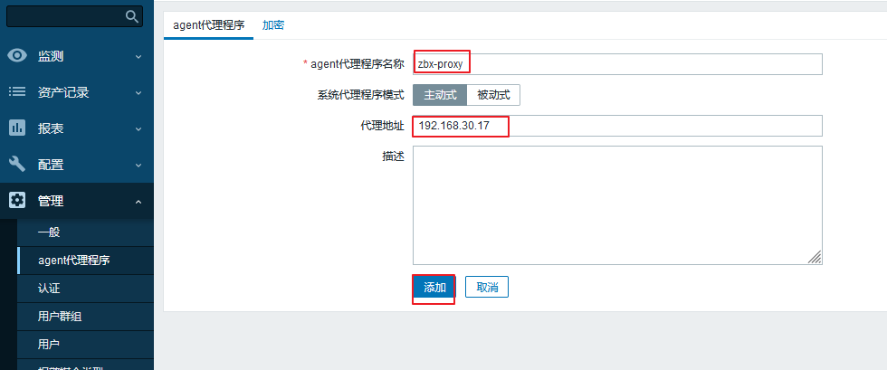 配置 agent 使用 proxy 1.在客户端修改 agent2 配置文件 vim /etc/zabbix/zabbix_agent2.conf ...... Server=192.168.30.17 #80行,指定 zabbix 代理服务器的 IP 地址 ServerActive=192.168.30.17 #120行,指定 zabbix 代理服务器的 IP 地址 2.在 Web 页面配置 点击左边菜单栏【配置】中的【主机】,点击【创建主机】 【主机名称】设置成 zbx-agent01 【可见的名称】设置成 zbx-agent01 【群组】选择 Linux server 【Interfaces】的【IP地址】设置成 192.168.30.16 【由agent代理程序监测】选择 zbx-proxy 再点击上方菜单栏【模板】 【Link new tamplates】搜索 Linux ,选择 Template OS Linux by Zabbix agent 点击 【添加】 3.分别在客户端和代理服务器上重启服务 systemctl restart zabbix-agent2 systemctl restart zabbix-proxy 点击左边菜单栏【配置】中的【主机】刷新,查看客户端主机监控状态正常 在服务端查看日志 tail -f /var/log/zabbix/zabbix_proxy.log