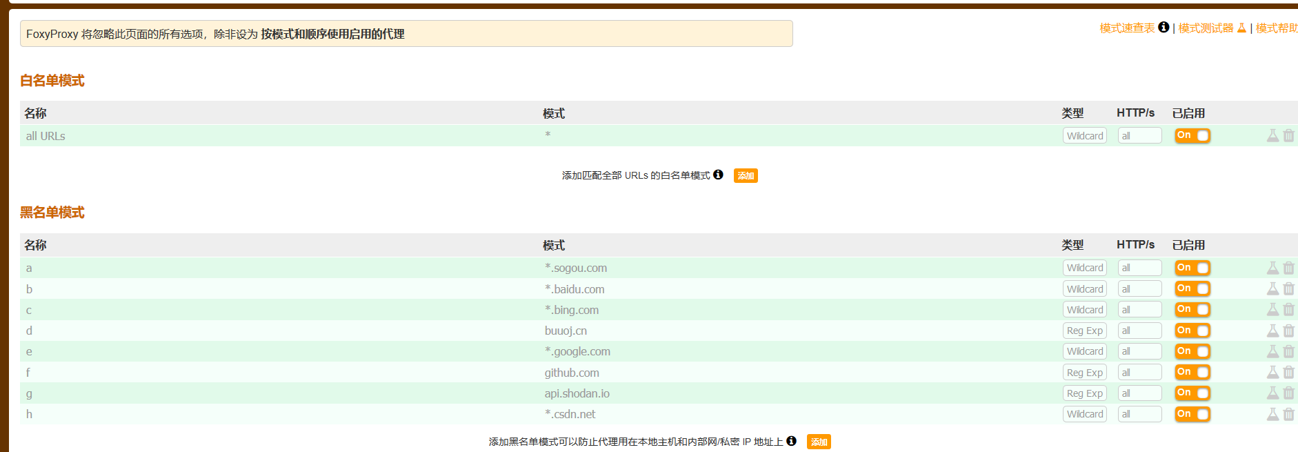 FoxyProxy配置里黑名单就是配置那些无需代理直接连接的网址,比如www.sogou.com等,类型为wildcard是指通配符类型,所以可以使用*.sogou.com等其他通配符来判断,类型为Reg Exp,则直接匹配(猜的),