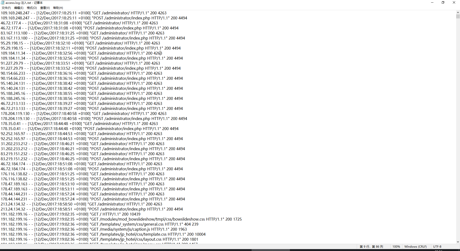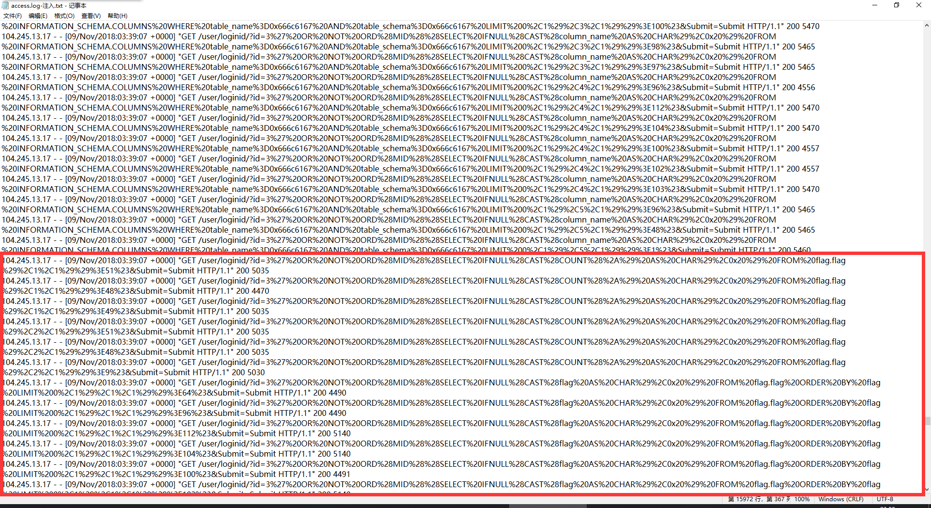 获取到log.txt,这是把access.log里成功的响应包提取出来,再来个脚本推算,比如第一个字符,4条数据,找出最大的那个即101加1即可得出该字符,具体可以看我另一张博客,其实都差不多的2333.