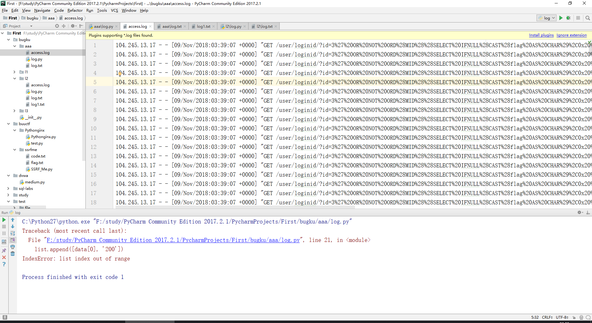 打开日志看下,前面看不出什么,但是最后面就很明显,url解码后是sq盲注