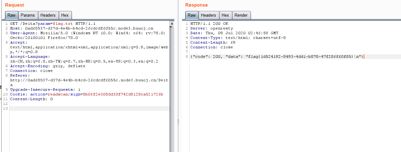 再去De1ta中传参数param=flag.txt action=readscan sign=8b06f2e308dd30f742d8128ca521726b