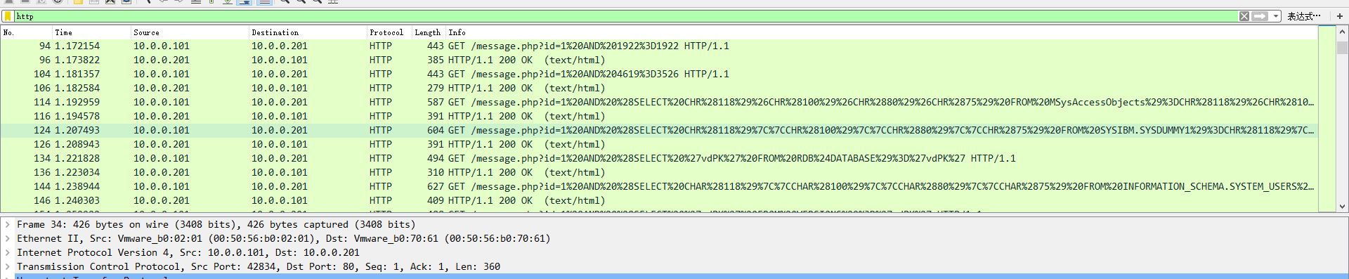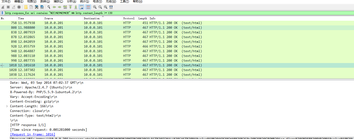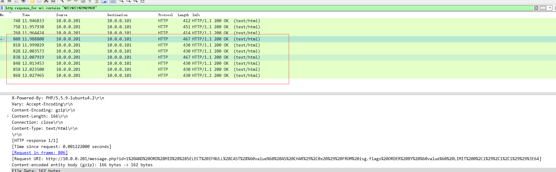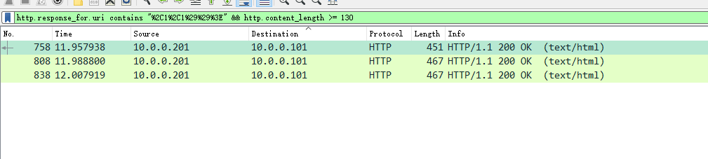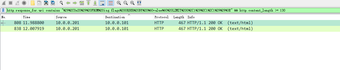 要去掉回显为0的包,我找了蛮久,但只有个http.content_length >= 130,这个130我是对比分析回显0和1两种包的File Data长度来取的,回显为0的File Data长度大概在120上下,回显为1的File Data长度大概在160上下,我就取个中间的值。