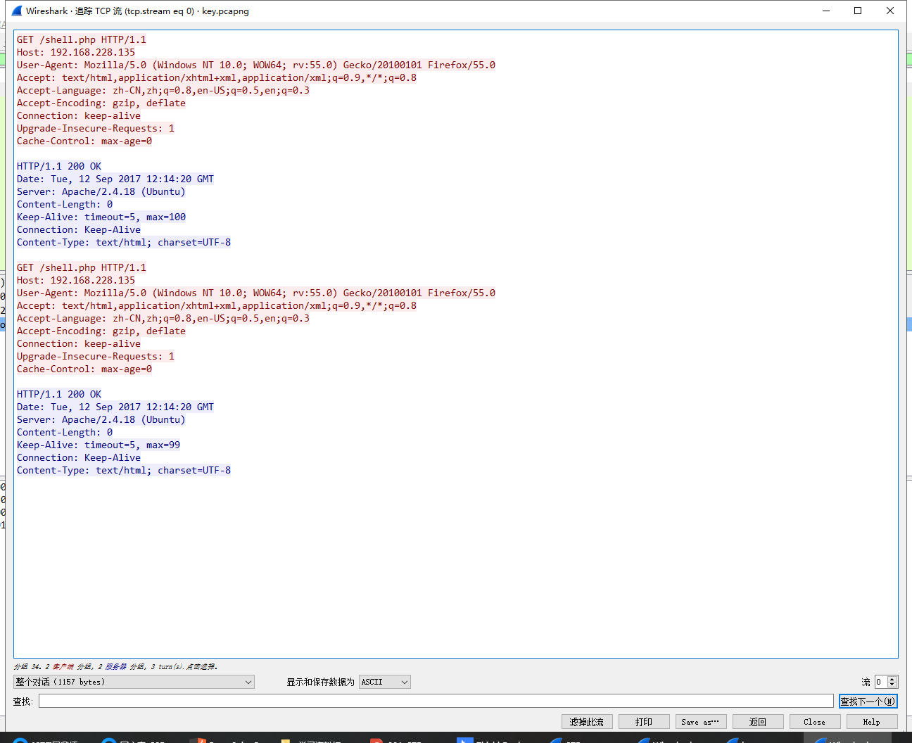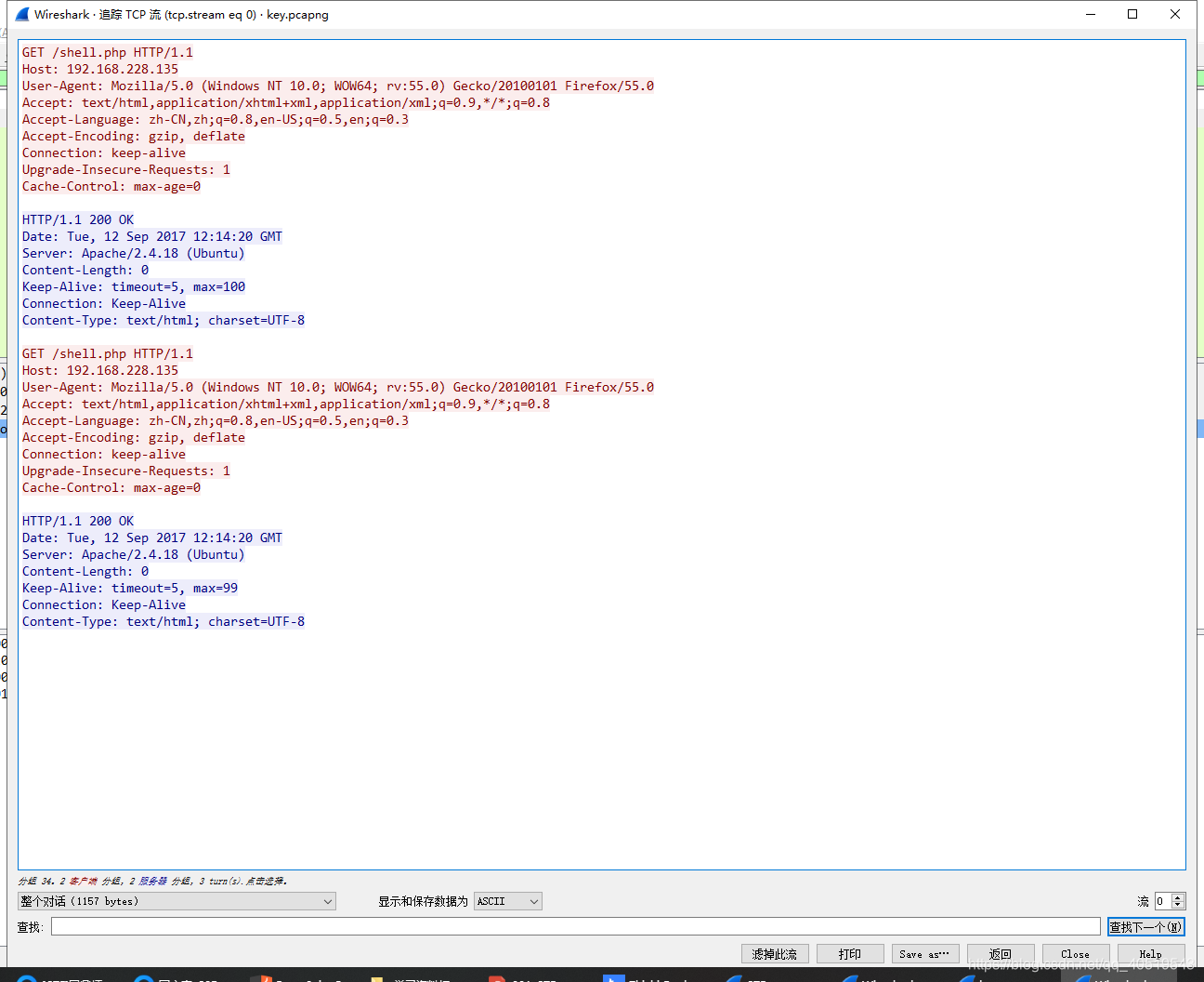 用wireshark打开文件后,随便对一个tcp进行追踪tcp流,就能发现一个shell.php的请求