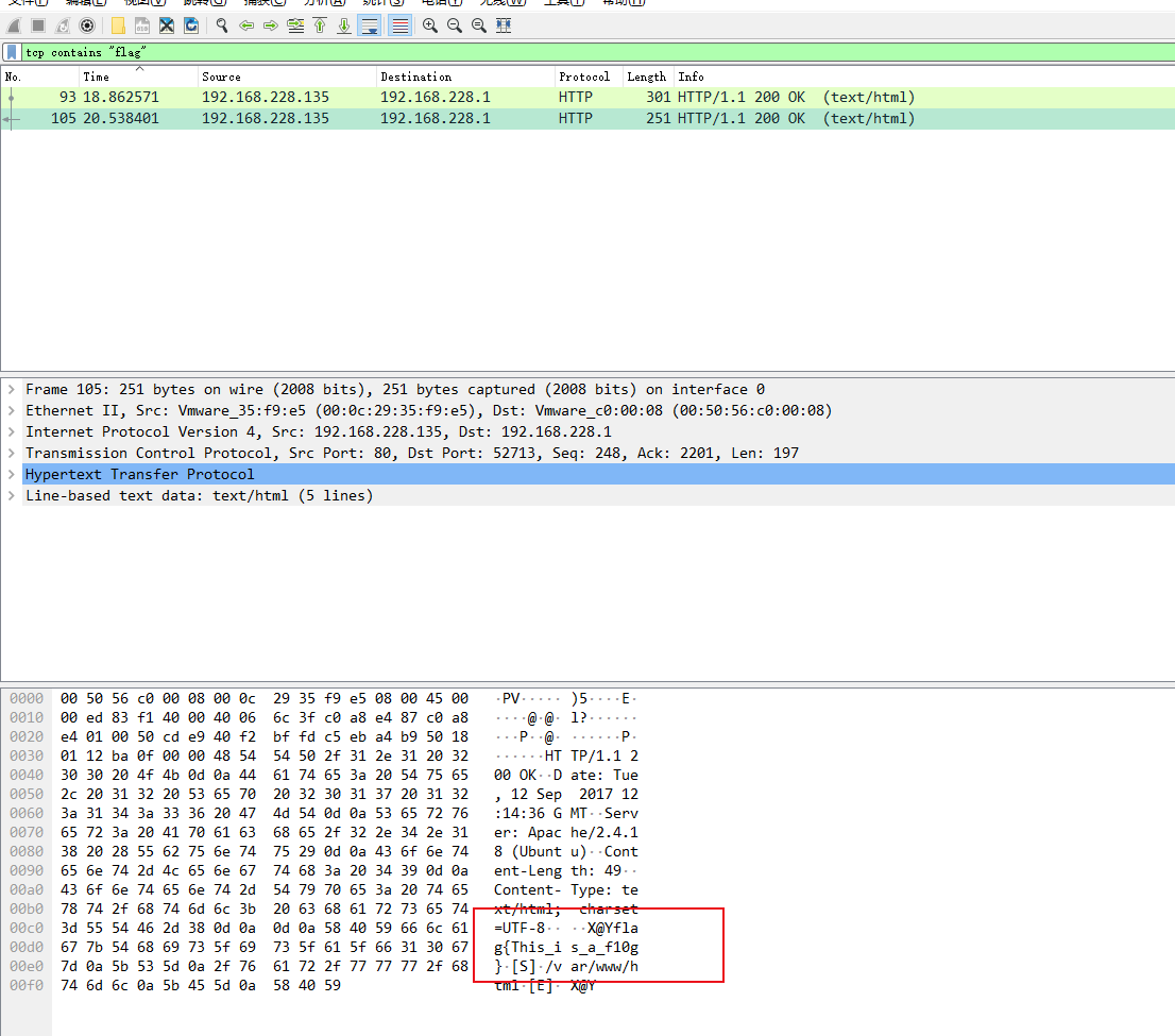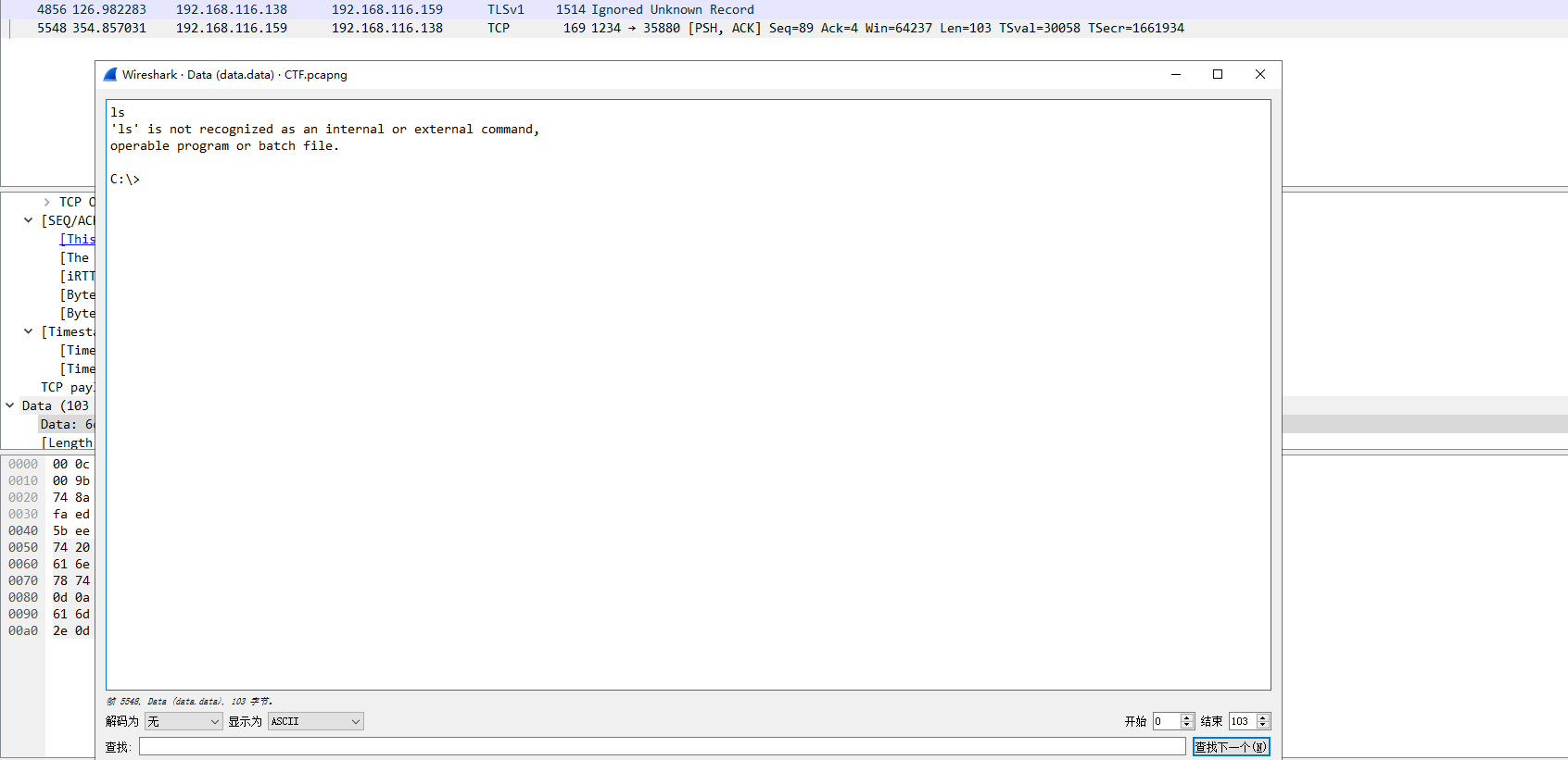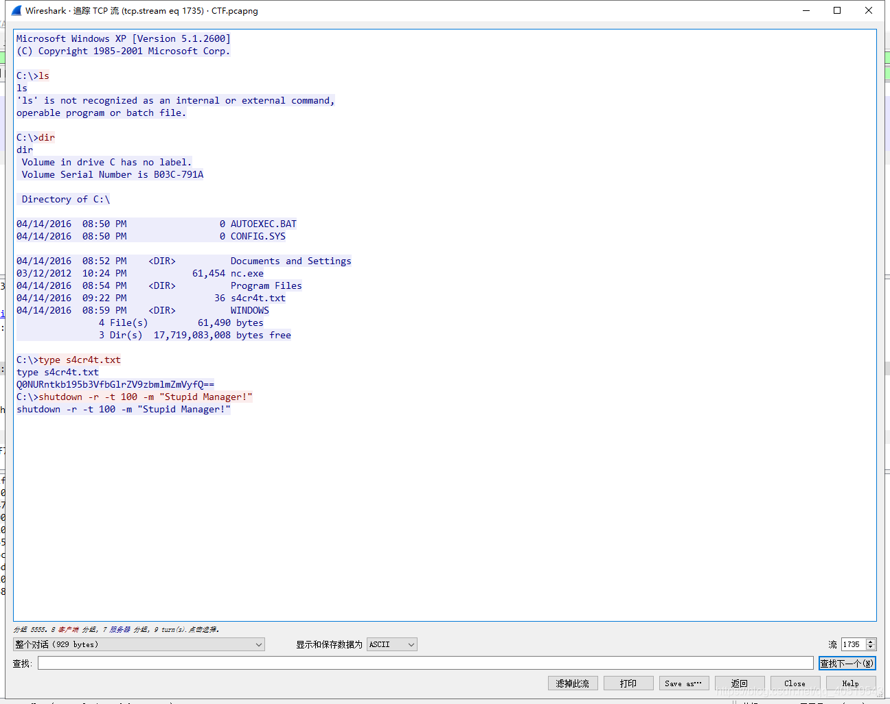 打开一看,好多坏包,太多了无法分析,肯定需要使用过滤器对其进行过滤,但是使用tcp contains "flag" 无法获取到flag,想也觉得没这么简单23333