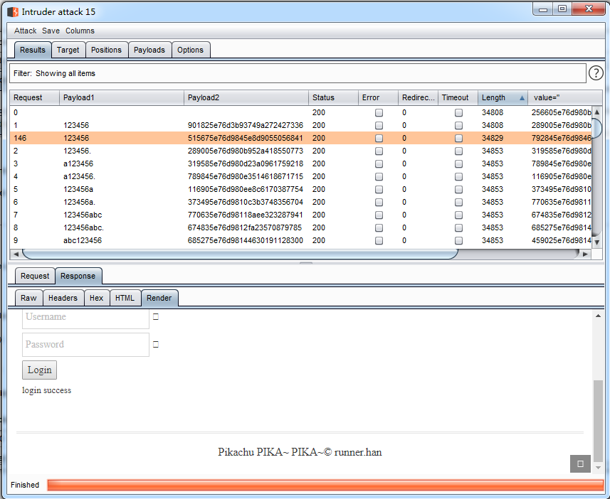 pitchfork 不同于sniper,pitchfork简单理解就是你设置了几个变量,他就能用几个payload,我们设置2个,就有2个payload,并且一一对应。