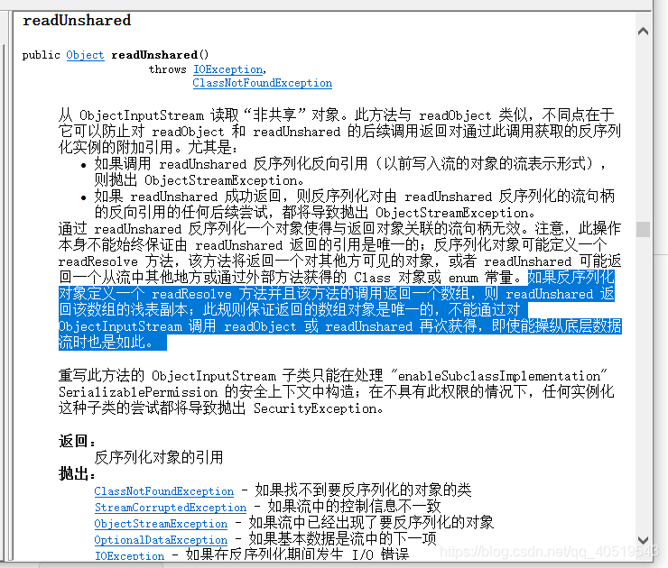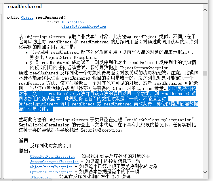 在ObjectOutputStream类中的readUnshared()方法中有解释: