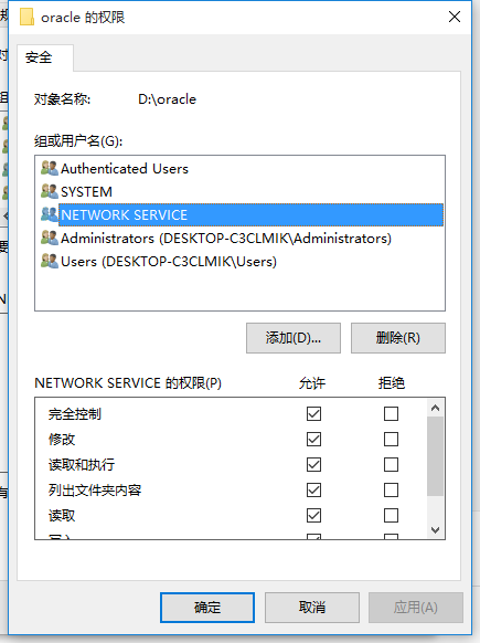 3.给D盘下面oracle文件夹安全添加NETWORK SERVICE完全控制权限