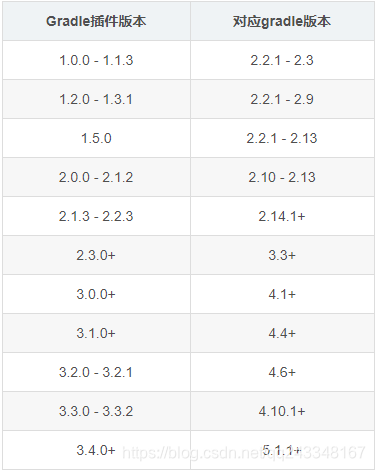 Android Studio一开始安装2.1.3在编译到模拟器的时候报错说和gradle的版本不止一致。我这边项目gradle版本是gradle-2.14.1-all,下面是gradle对应Gradle插件的版本,Gradle插件版本要和Android Studio的版本一致。
