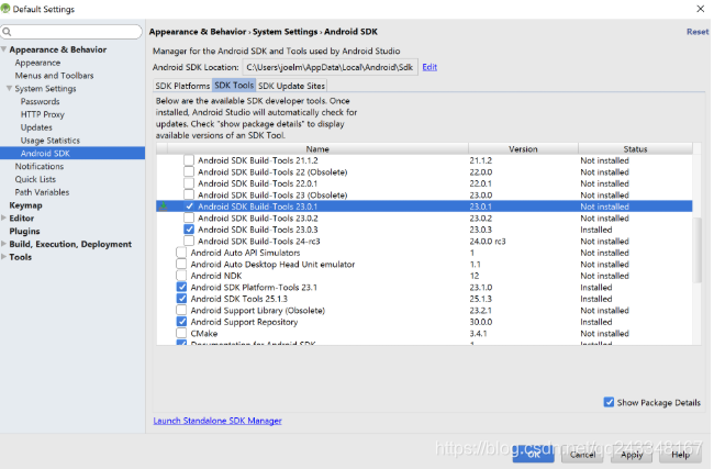 在SDK Tools窗口中,选择Show Package Details,然后在Android SDK Build Tools中勾选Android SDK Build-Tools 23.0.1(必须是这个版本)。然后还要勾选最底部的Android Support Repository.