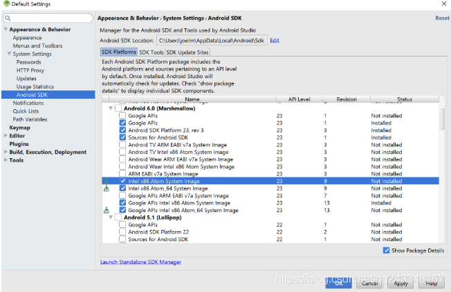 在SDK Platforms窗口中,选择Show Package Details,然后在Android 6.0 (Marshmallow)中勾选Google APIs、Android SDK Platform 23、Intel x86 Atom System Image、Intel x86 Atom_64 System Image以及Google APIs Intel x86 Atom_64 System Image。