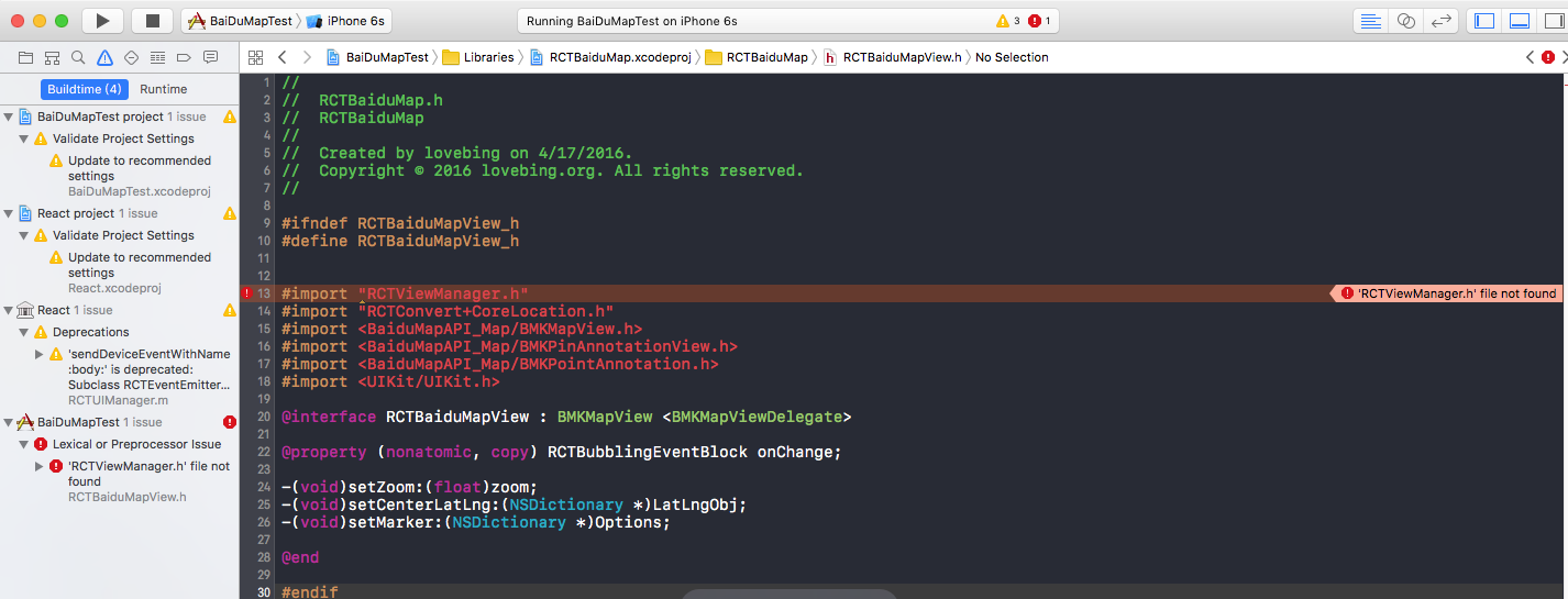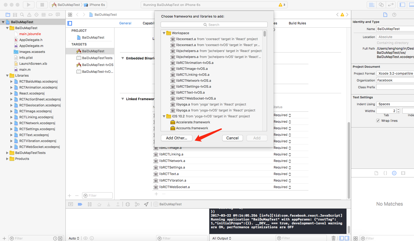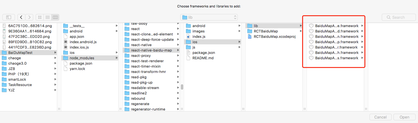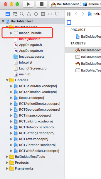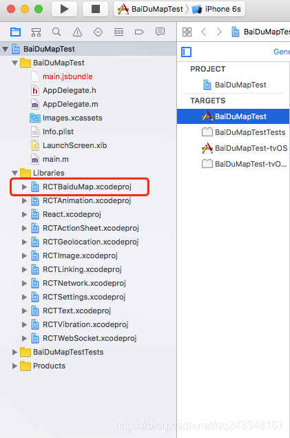 1.Project navigator->Libraries->Add Files to 选择 react-native-baidu-map/ios/RCTBaiduMap.xcodeproj