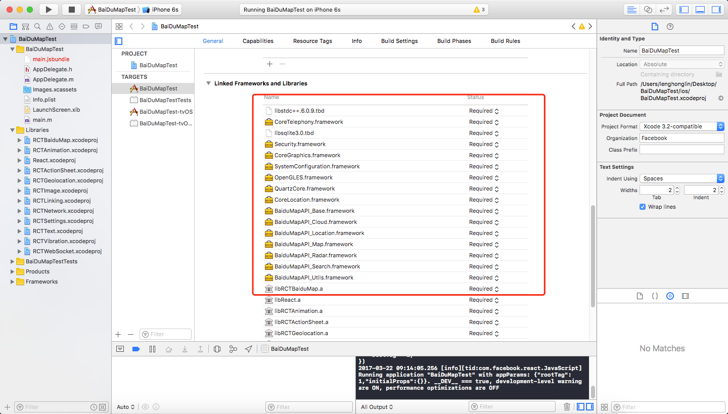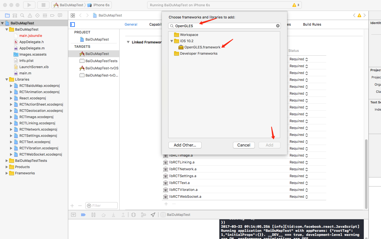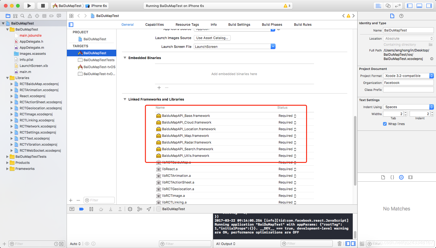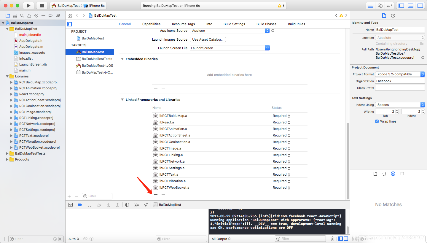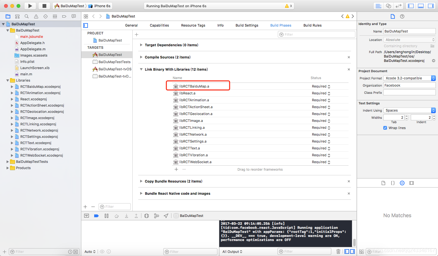 2.Project navigator->Build Phases->Link Binary With Libraries 加入 libRCTBaiduMap.a