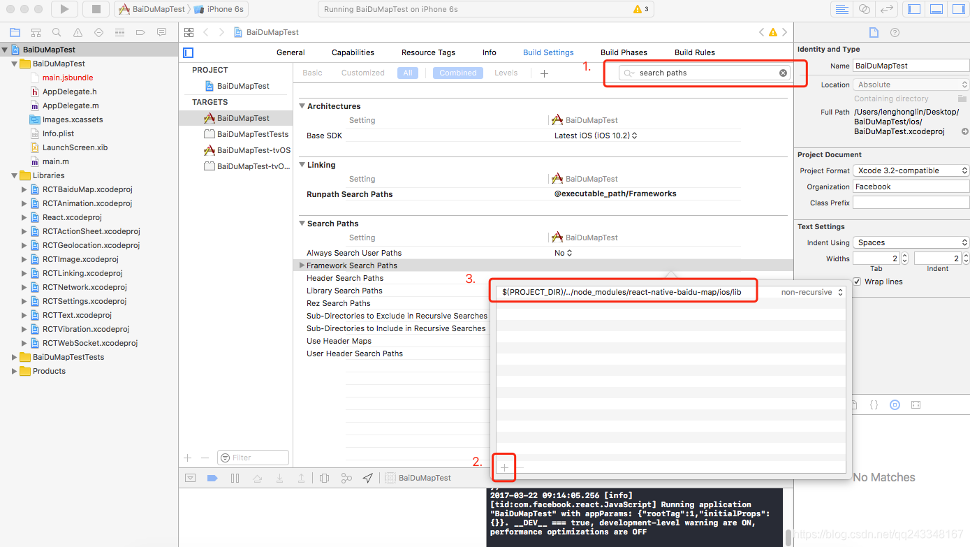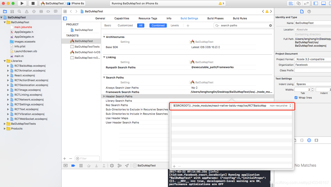 3.Project navigator->Build Settings->Search Paths, Framework search paths 添加$(PROJECT_DIR)/../node_modules/react-native-baidu-map/ios/lib,Header search paths 添加 $(SRCROOT)/../node_modules/react-native-baidu-map/ios/RCTBaiduMap