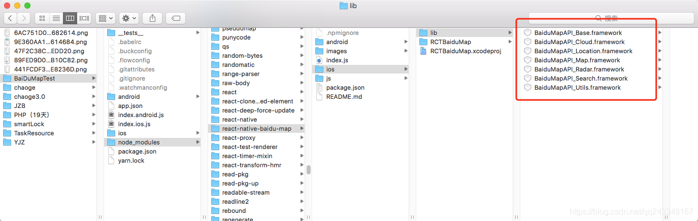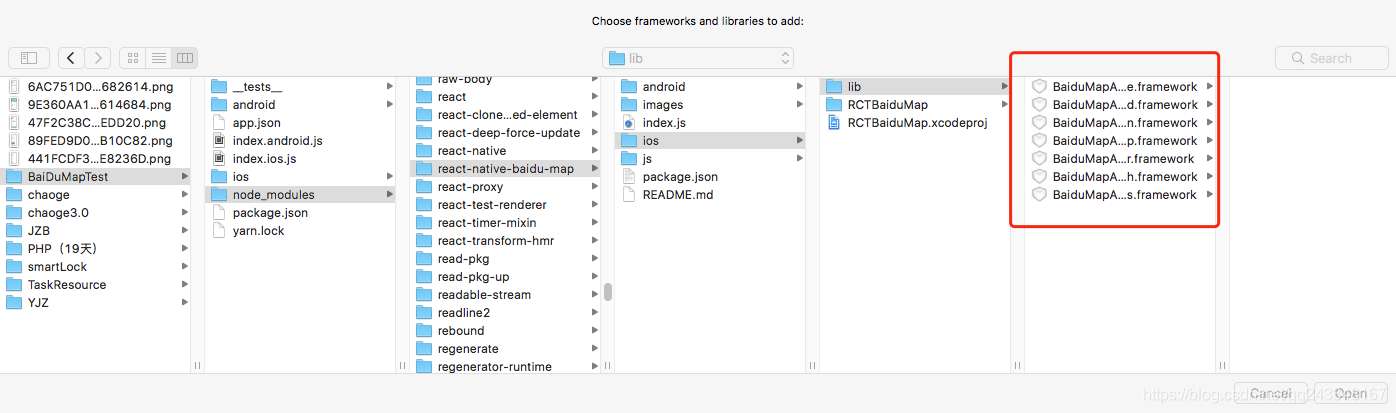 4.添加依赖, react-native-baidu-map/ios/lib 下的全部 framwordk