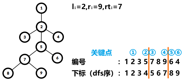 当在以点 \(u\) 为根的子树外不存在编号在 \([l_i,r_i]\) 中的点时,可以构造一个以点 \(rt_i\) 为根的 \(\text{dfs}\) 序,满足在编号在 \([l_i,r_i]\) 中的点中 \(\text{dfs}\) 序最小的点为关键点 ② 或者关键点 ⑤,最大的点为关键点 ① 或者关键点 ⑥,区间的 \(\text{LCA}\) 和关键点的 \(\text{LCA}\) 都为关键点 ①②⑤⑥ 的 \(\text{LCA}\)。