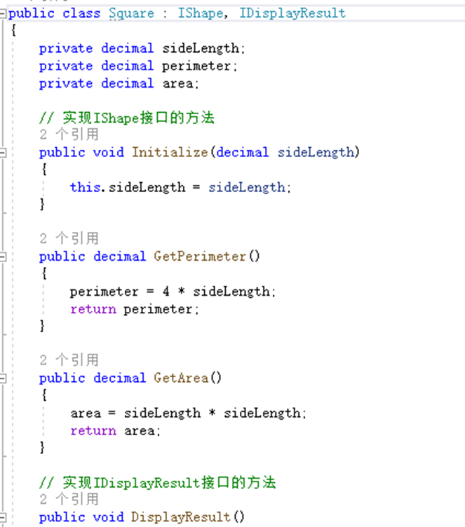 别进行初始化、获取边长和面积,其返回值均为 decimal。接口 IDisplayresult 显示计算结果。