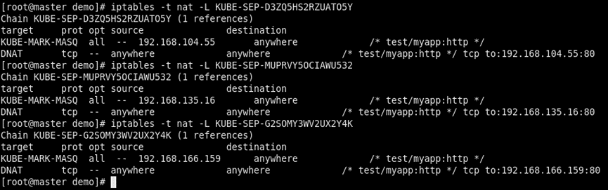 - 看下每条KUBE-SEP链,三条规则对应三个endpoint,匹配到的概率见上图