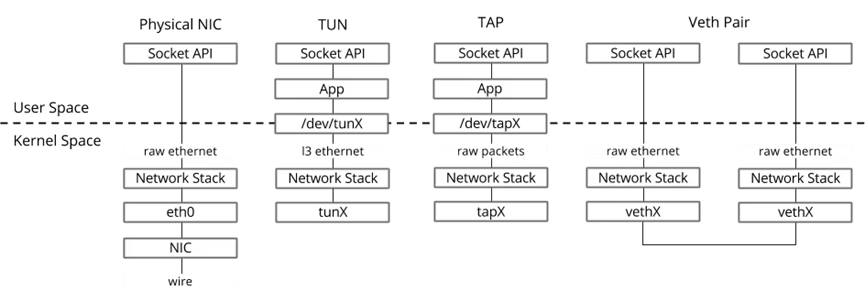 VETH出现较早,它的作用是反转通讯数据的方向,需要发送的数据会被转化成需要收到的数据重新送入内核网络层进行处理,从而间接完成数据的注入
