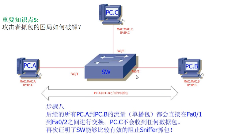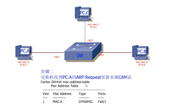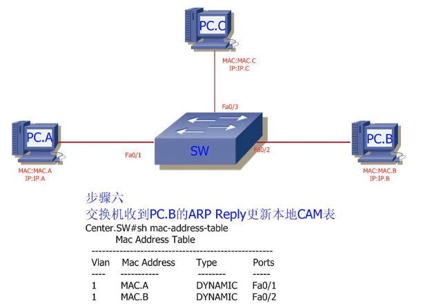 3.8 后续PC.A <->PC.B的流量只会在相关接口之间进行交换,PC.C不会收到任何数据包