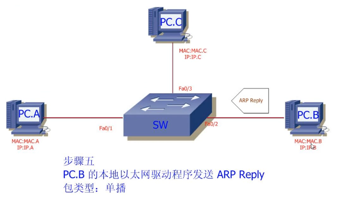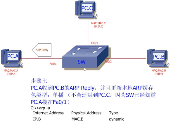 3.7 ARP Reply,只会从FA0/1接口出,因为SW已经知道PC.A接在FA0/1口上