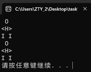 #define _CRT_SECURE_NO_WARNINGS #include <stdio.h> #include <stdlib.h> int main() { printf(" O \n"); printf("<H>\n"); printf("I I\n"); printf(" O \n"); printf("<H>\n"); printf("I I\n"); system("pause"); return 0; }