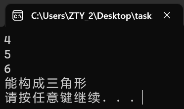 #define _CRT_SECURE_NO_WARNINGS #include <stdio.h> #include <stdlib.h> int main() { float a, b, c; scanf("%f%f%f", &a, &b, &c); if (a + b > c && a + c > b && b + c > a) printf("能构成三角形\n"); else printf("不能构成三角形\n"); system("pause"); return 0; }
