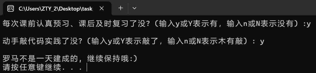 #define _CRT_SECURE_NO_WARNINGS #include <stdio.h> #include <stdlib.h> int main() { char ans1, ans2; printf("每次课前认真预习、课后及时复习了没? (输入y或Y表示有,输入n或N表示没有) :"); ans1 = getchar(); getchar(); printf("\n动手敲代码实践了没? (输入y或Y表示敲了,输入n或N表示木有敲) : "); ans2 = getchar(); if ((ans2 == 'y' && ans1 == 'y') || (ans1 == 'Y' && ans2 == 'Y') || (ans1 == 'Y' && ans2 == 'y') || (ans1 == 'y' && ans2 == 'Y')) printf("\n罗马不是一天建成的, 继续保持哦:)\n"); else printf("\n罗马不是一天毁灭的, 我们来建设吧\n"); system("pause"); return 0; }