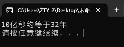 #define _CRT_SECURE_NO_WARNINGS #include<stdio.h> #include <stdlib.h> int main() { int year; const double second = 1e9; double temp = ((second / 3600) / 24) / 365; if (temp - (int)temp < 0.5) { year = (int)temp; } else { year = (int)temp + 1; } printf("10亿秒约等于%d年\n", year); system("pause"); return 0; }