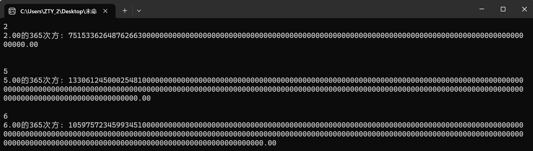#define _CRT_SECURE_NO_WARNINGS #include <stdio.h> #include <math.h> #include <stdlib.h> int main() { double x, ans; while (scanf("%lf", &x) != EOF) { ans = pow(x, 365); printf("%.2f的365次方: %.2f\n", x, ans); printf("\n"); } system("pause"); return 0; }