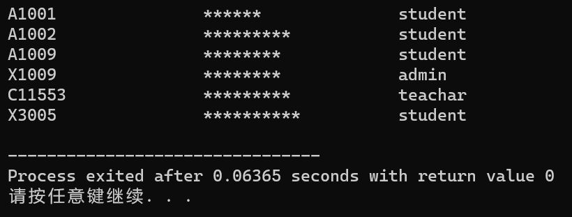 #include <stdio.h> #include <string.h> enum Role {admin, student, teacher}; typedef struct { char username[20]; char password[20]; enum Role type; } Account; void output(Account x[], int n); int main() { Account x[] = {{"A1001", "123456", student}, {"A1002", "123abcdef", student}, {"A1009", "xyz12121", student}, {"X1009", "9213071x", admin}, {"C11553", "129dfg32k", teacher}, {"X3005", "921kfmg917", student}}; int n; n = sizeof(x)/sizeof(Account); output(x, n); return 0; } void output(Account x[], int n) { int i,j; for (i=0;i<n;i++) { printf("%-20s",x[i].username); for (j=0;j<strlen(x[i].password);j++) printf("*"); for (;j<20;j++) printf(" "); switch(x[i].type) { case 0:printf("admin");break; case 1:printf("student");break; case 2:printf("teacher");break; } printf("\n"); } }
