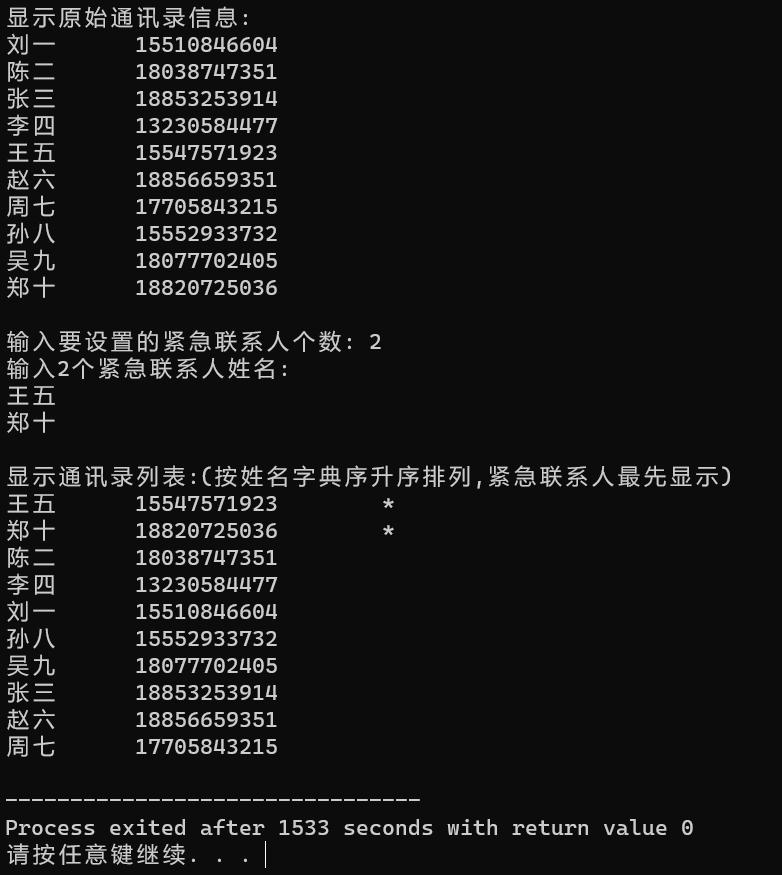 #include <stdio.h> #include <string.h> typedef struct { char name[20]; // 姓名 char phone[12]; // 手机号 int vip; // 是否为紧急联系人,是取1;否则取0 } Contact; // 函数声明 void set_vip_contact(Contact x[], int n, char name[]); // 设置紧急联系人 void output(Contact x[], int n); // 输出x中联系人信息 void display(Contact x[], int n); // 按联系人姓名字典序升序显示信息,紧急联系人最先显示 #define N 10 int main() { Contact list[N] = {{"刘一", "15510846604", 0}, {"陈二", "18038747351", 0}, {"张三", "18853253914", 0}, {"李四", "13230584477", 0}, {"王五", "15547571923", 0}, {"赵六", "18856659351", 0}, {"周七", "17705843215", 0}, {"孙八", "15552933732", 0}, {"吴九", "18077702405", 0}, {"郑十", "18820725036", 0}}; int vip_cnt, i; char name[20]; printf("显示原始通讯录信息: \n"); output(list, N); printf("\n输入要设置的紧急联系人个数: "); scanf("%d", &vip_cnt); printf("输入%d个紧急联系人姓名:\n", vip_cnt); for(i = 0; i < vip_cnt; ++i) { scanf("%s", name); set_vip_contact(list, N, name); } printf("\n显示通讯录列表:(按姓名字典序升序排列,紧急联系人最先显示)\n"); display(list, N); return 0; } // 补足函数set_vip_contact实现 // 功能:将联系人数组x中,联系人姓名与name一样的人,设置为紧急联系人(即成员vip值设为1) void set_vip_contact(Contact x[], int n, char name[]) { int i; for(i=0;i<n;i++){ if(strcmp(x[i].name,name)==0) x[i].vip=1; } } // 补足函数display实现 // 功能: 显示联系人数组x中的联系人信息 // 按姓名字典序升序显示, 紧急联系人显示在最前面 void display(Contact x[], int n) { int i,j=0,k,a=0,b; Contact t[N],s[N],m; for(i=0;i<n;i++){ if(x[i].vip) t[j++]=x[i]; else s[a++]=x[i]; } k=j; for(i=0;i<k-1;i++){ for(j=i+1;j<k;j++){ if(strcmp(t[i].name ,t[j].name )>0){ m=t[i]; t[i]=t[j]; t[j]=m; } } } b=a; for(i=0;i<b-1;i++){ for(j=i+1;j<b;j++){ if(strcmp(s[i].name ,s[j].name )>0){ m=s[i]; s[i]=s[j]; s[j]=m; } } } for(i=0;i<k;i++) x[i]=t[i]; for(j=0;j<b;j++) x[i++]=s[j]; output(x,n); } void output(Contact x[], int n) { int i; for(i = 0; i < n; ++i) { printf("%-10s%-15s", x[i].name, x[i].phone); if(x[i].vip) printf("%5s", "*"); printf("\n"); } }