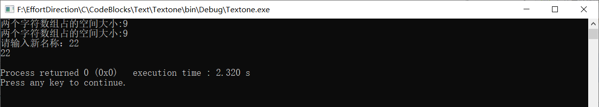 1 #include<stdio.h> 2 #include<stdlib.h> 3 int main() 4 { 5 //字符串和字符数组的区别:最后一位是否是 \0,空字符 有的为 字符串 没有的 为字数组 6 //所有的字符串都是字符数组 对的 7 //所有的字符数组都是字符串 错的. 8 // char names1[9] = {'z','h','e','n','g','l','e','i','\0'}; 9 char names1[] = {'z','h','e','n','g','l','e','i','\0'}; //一样的 10 char names2[] ="zhenglei"; 11 // char *names3 = "zhenglei" 12 13 printf("两个字符数组占的空间大小:%d\n",sizeof(names1)); 14 printf("两个字符数组占的空间大小:%d\n",sizeof(names2)); 15 16 17 //动态录入 18 printf("请输入新名称:"); 19 scanf("%s",names2); //gets(names2); 20 printf("%s\n",names2); //puts(names2) 21 22 23 return 0; 24 }