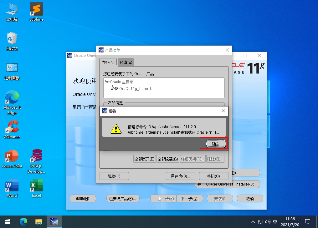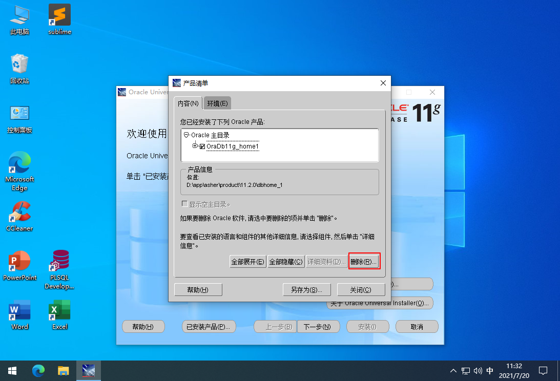 确定后,打开Oracle安装路径下载dbhome_1文件夹(本人路径D:\app\asher\product\11.2.0\dbhome_1)打开deinstall.bat