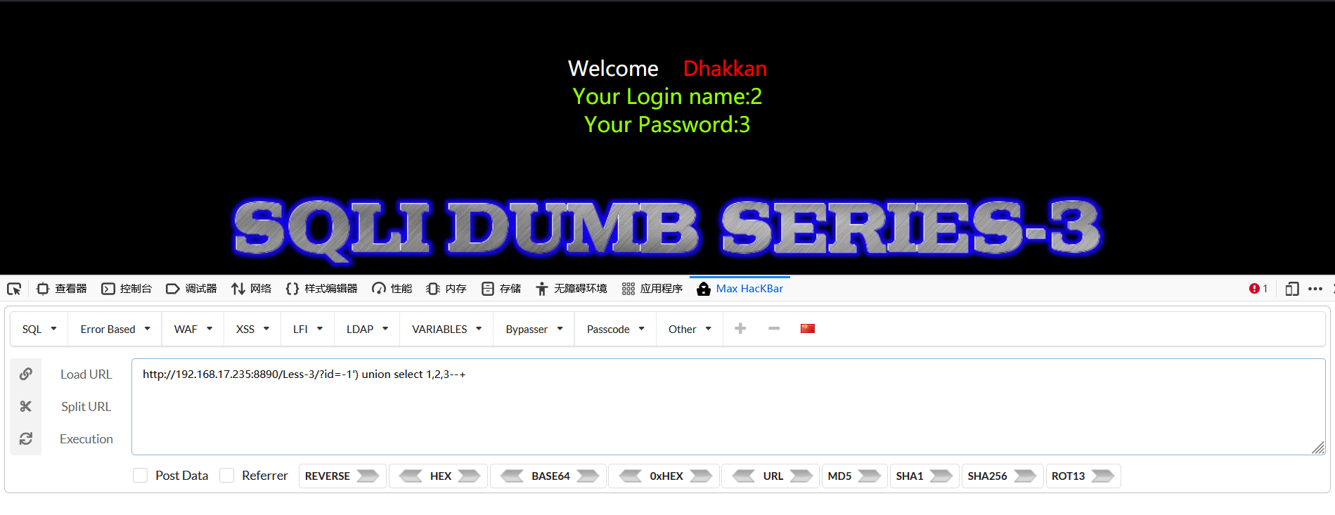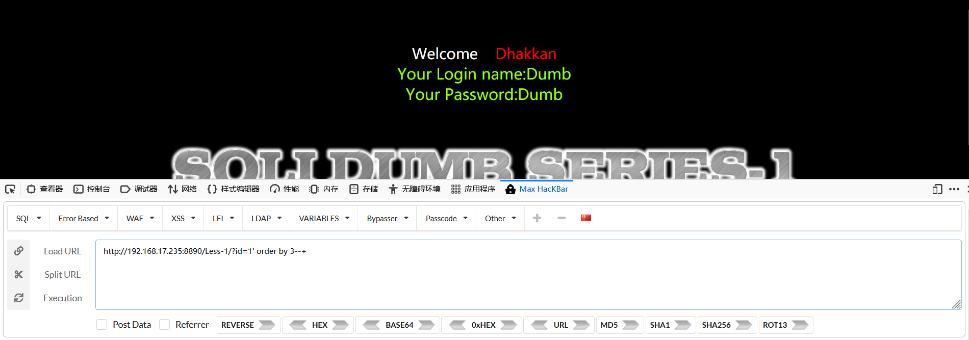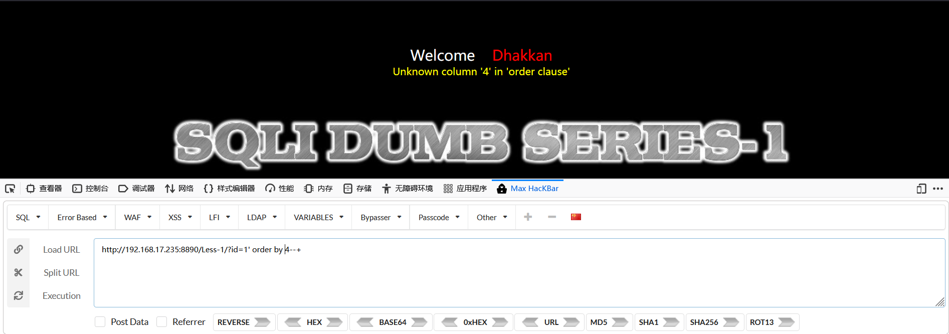 然后我们可以构造相应的注入语句,首先判断列数输入'order by 3--+正常回显,输入‘order by 4--+无回显就说明有3列