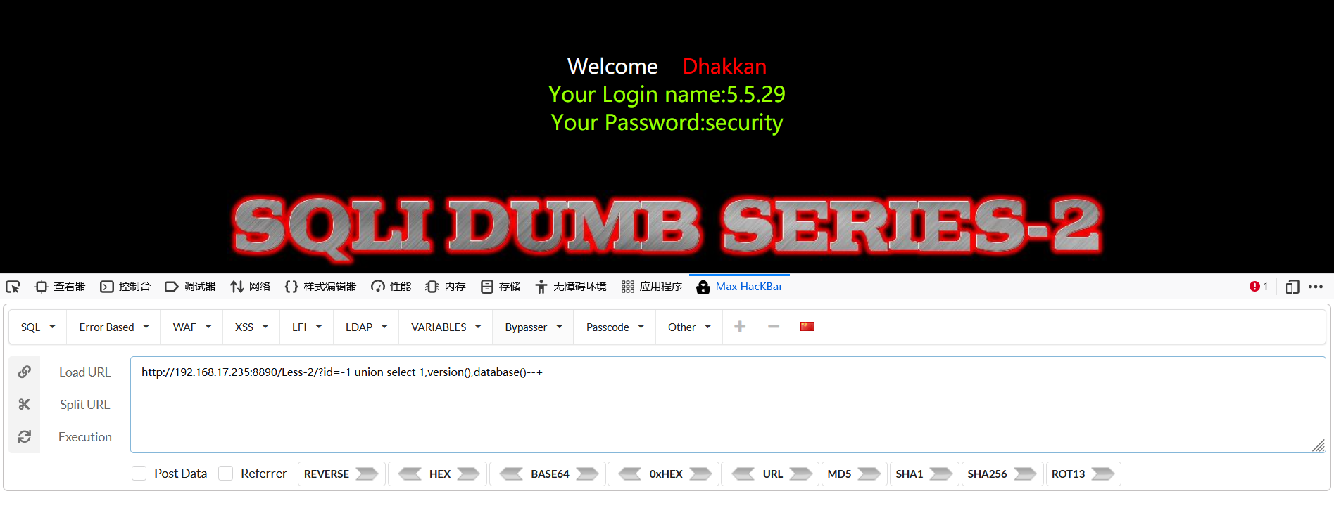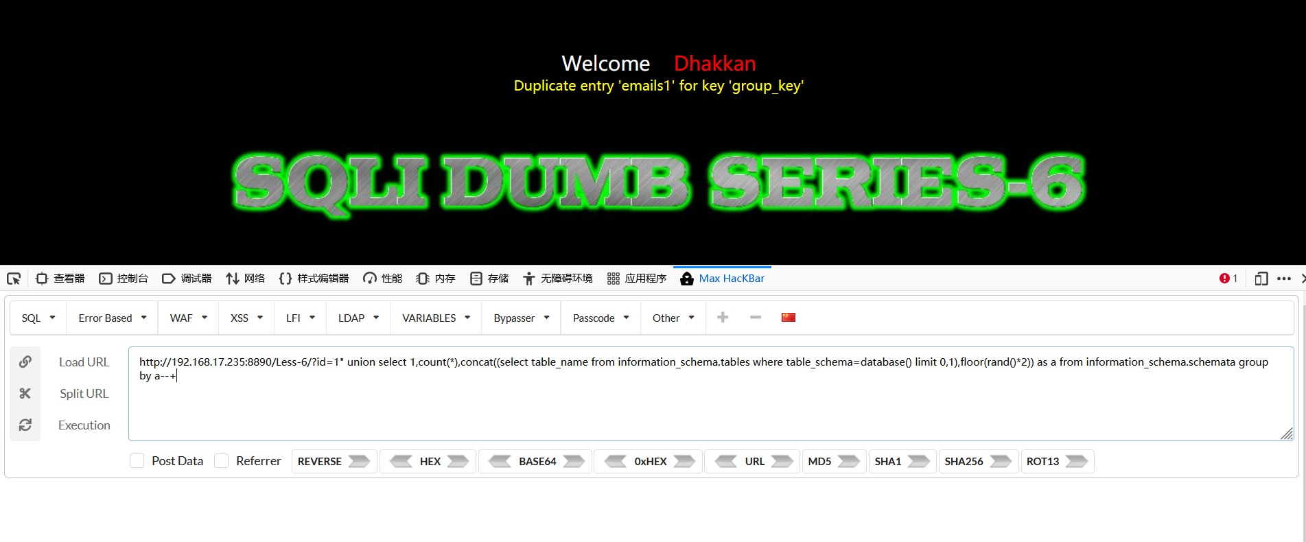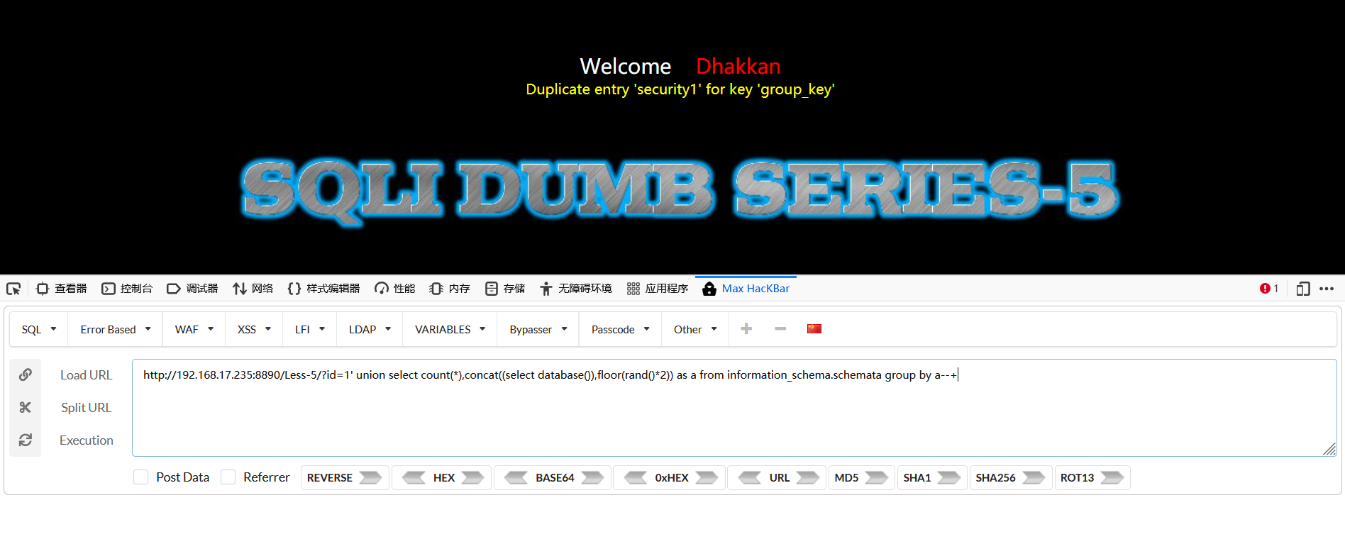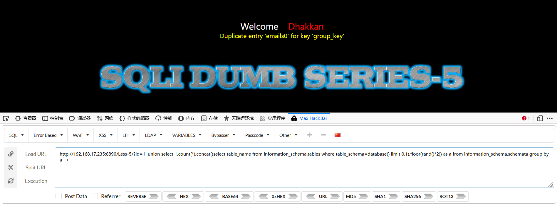 这首先想到的是布尔盲注,但是看pass5的名字却是double query,根据字面意思是双查询。。。根据查阅资料后,通俗的来说在select中嵌套select来查询想要的数据,在通过mysql内部函数错误将错误信息和查询的数据一同输出