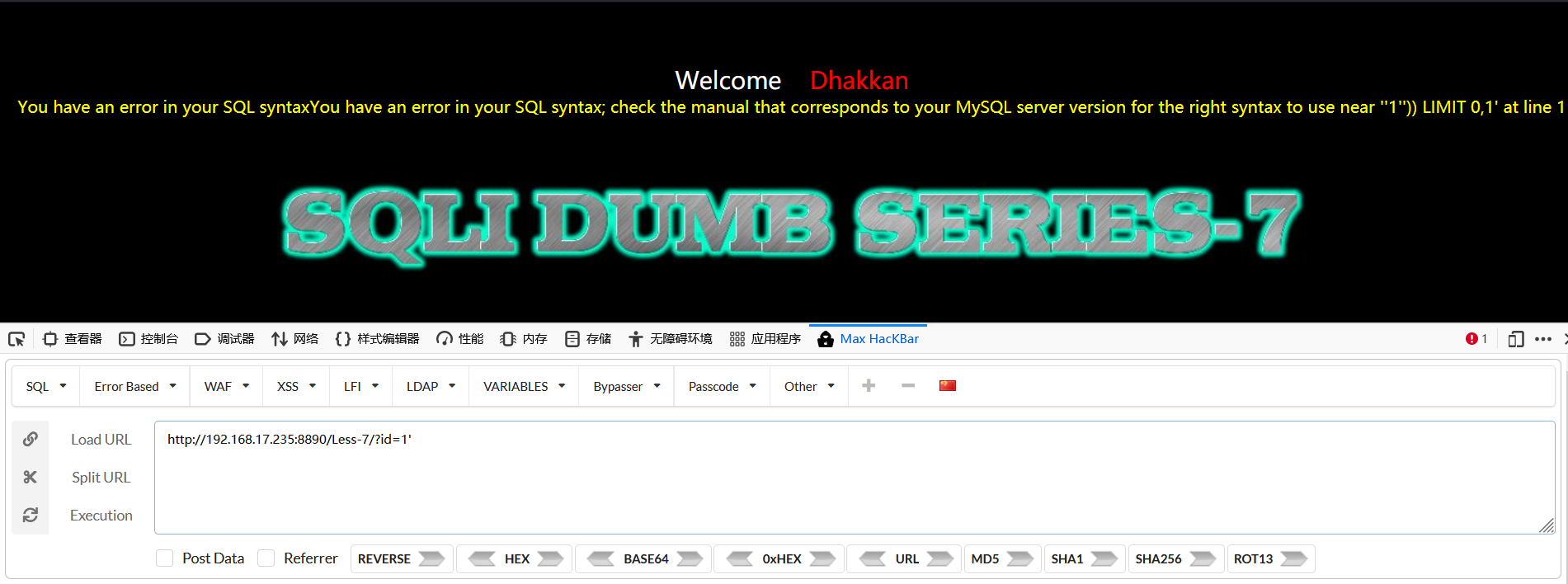 还是一样输入id=1',返回错误信息,这次包含了两个括号那么闭合前面的也需要两个括号