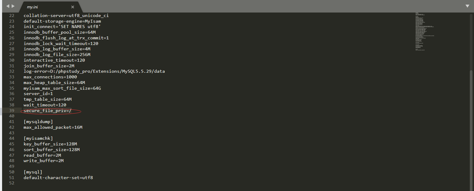 因为这里使用的phpstudy搭建的靶场,默认导出没有权限,所以更改mysql的配置文件,将secure_file_priv更改为为空,更改为/指定导出路径为根目录,更改为空是可导出到随意目录,还有一个null之无法导入导出